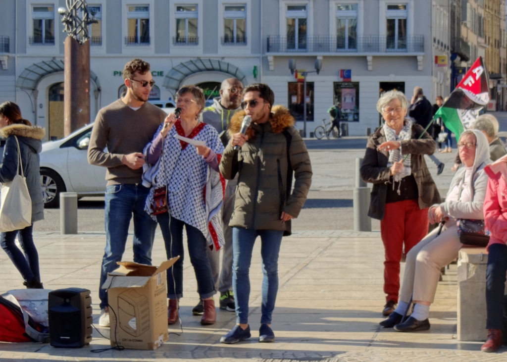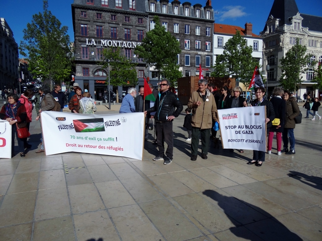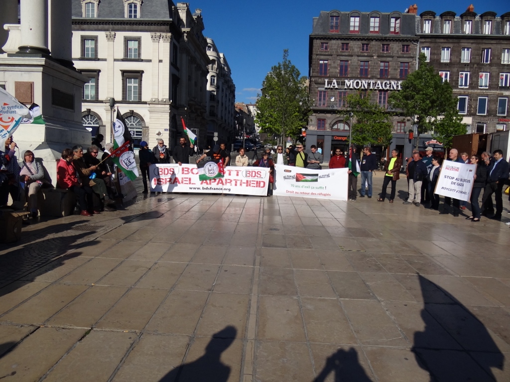 Des prises de parole de l’AFPS 63-BDSF 63 , de l’UNEF et du Collectif des Mosquées de Clermont-Auvergne ont rappelé, en ce jour anniversaire de la Nakba, la situation humanitaire dramatique de Gaza sous blocus et massacres, et la nécessité de BDS face à l’inaction ou la complicité des grandes puissances avec l’Etat colonial d’apartheid. La nécessité de se mobiliser plus largement a été soulignée. Des slogans ont été criés et parfois dansés entre les prises de parole :