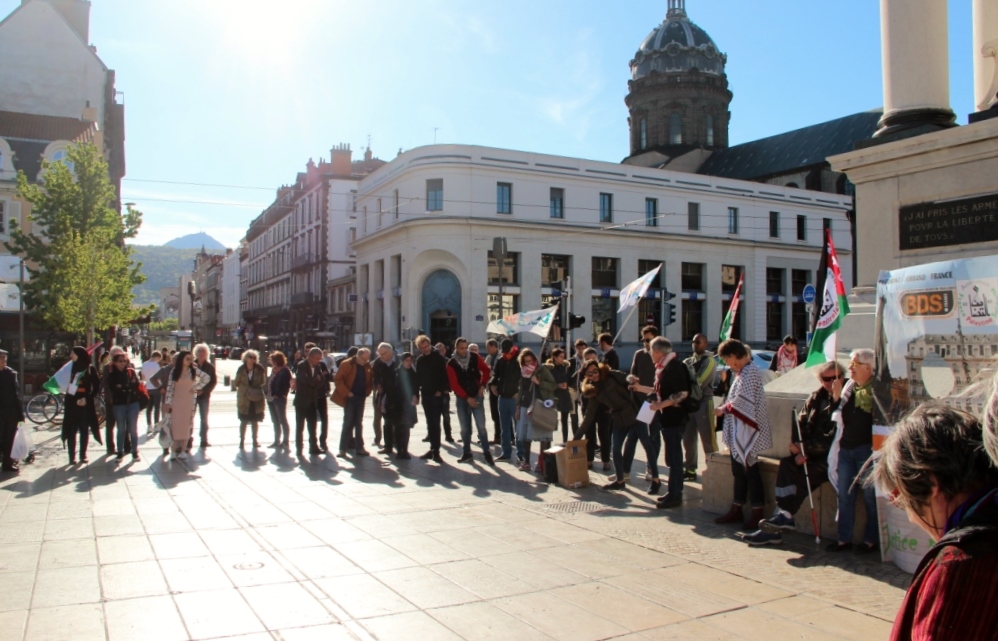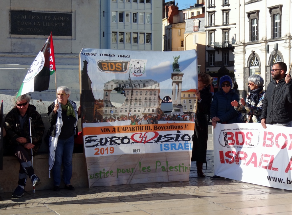 Cent-vingt personnes de tous âges et origines rassemblées à Clermont-Fd ont scandé de nombreux slogans devant Vercingétorix et un arrêt de tramway, pour la levée du blocus de Gaza, pour le Boycott et des Sanctions contre Israël, et contre l’Eurovision à Tel-Aviv.