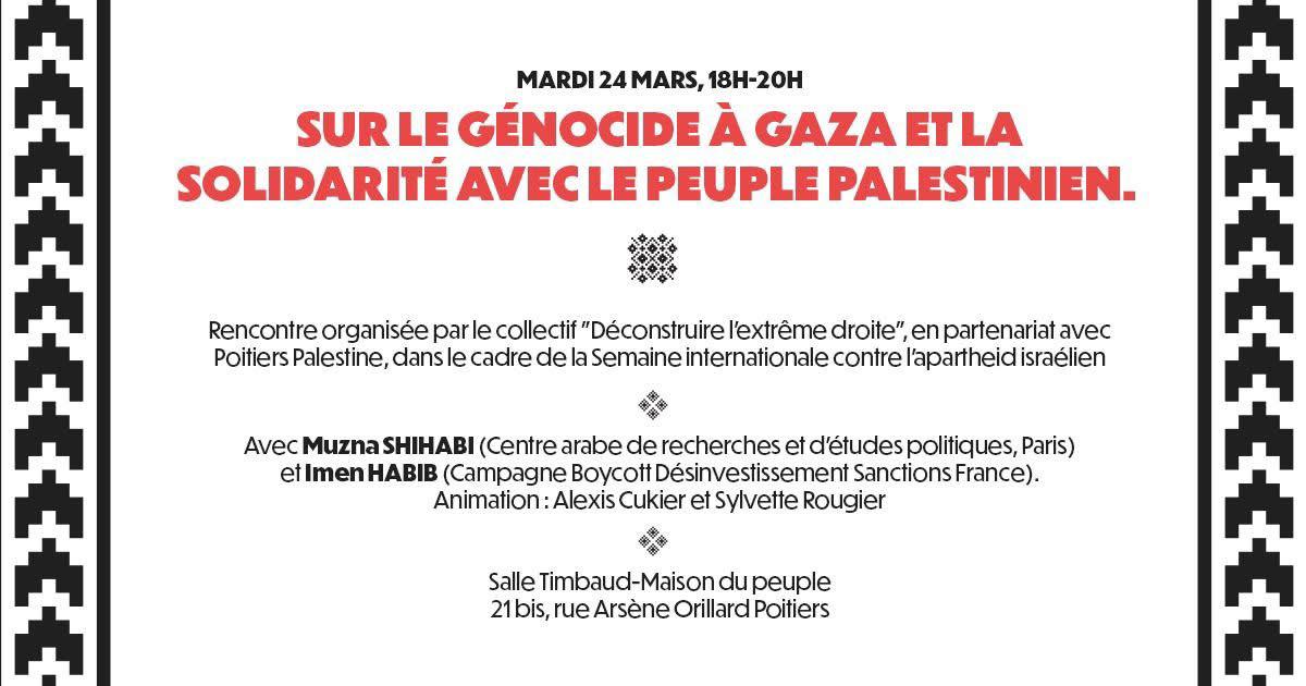 Rencontre organisée par le collectif « Déconstruire l’extrême droite », en partenariat avec Poitiers Palestine, dans le cadre de la Semaine internationale contre l’apartheid israélien (IAW).