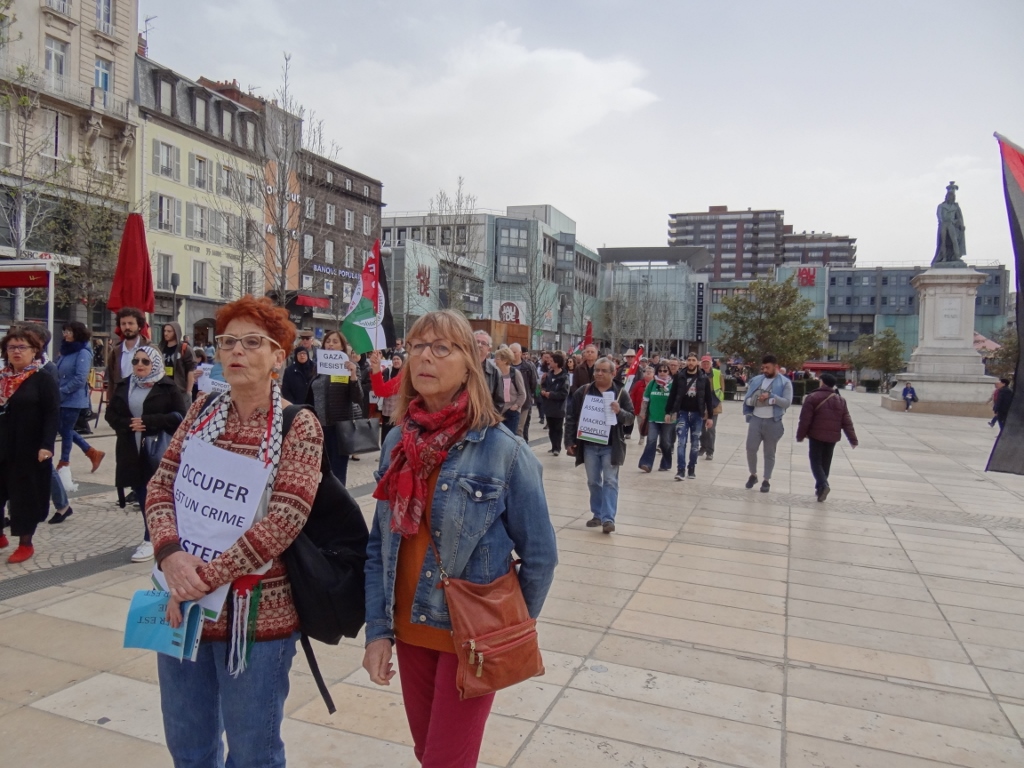 Comme ni Mr le Préfet, ni son représentant n’avaient prévu de nous recevoir ce samedi, nous sommes ensuite revenus sur la grand place au pied de la statue de Vercingétorix, et différentes organisations ont fait des prises de parole avant la dispersion de la manifestation : AFPS 63, MJCF 63, Albertville Vallée Jourdain Solidarité, UNEF et CGT. Ces prises de parole ont, notamment, appelé le gouvernement français à prendre des sanctions fortes, comme l’embargo militaire, et nos concitoyens à boycotter l’État israélien, aux niveaux politique, économique, culturel, sportif et universitaire.