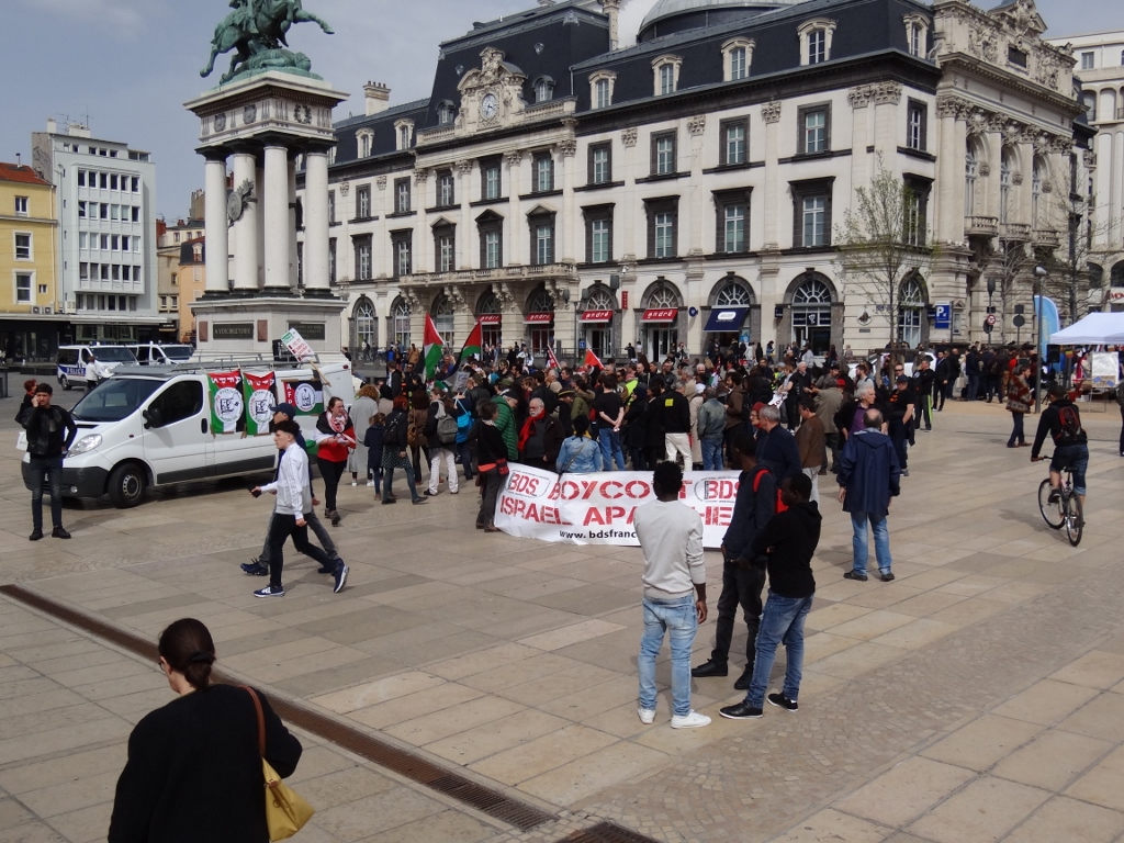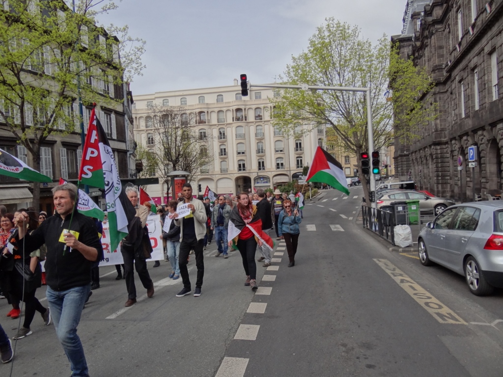 L’accueil des manifestants a été un peu chahuté par la sono d’un stand voisin de LREM en campagne pour les européennes de 2019, d’où quelques échanges verbaux et slogans dénonçant la complicité de Macron avec Israël, jusqu’à ce que des militants du Collectif Palestine aillent calmer le jeu, et qu’un cordon de policiers vienne s’interposer. La présence de ce stand LREM nous a toutefois valu une bonne visibilité de la manifestation dans le journal de FR3 Auvergne (voir entre 1 min 30 et 1 min 52) :