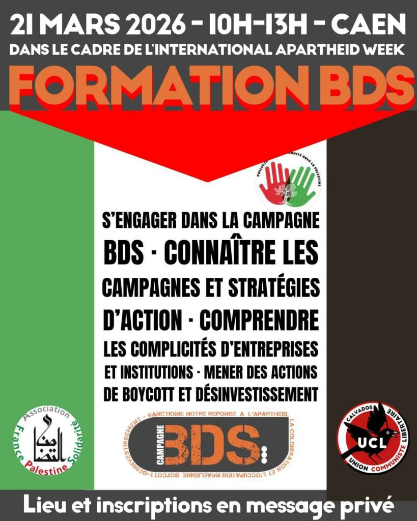 Aux côtés de l’AFPS et de l’UCL Caen, la Campagne BDS France intervient le samedi 21 mars de 10h à 13h pour une formation BDS. Pour s’inscrire, contactez le Collectif Palestine 14, groupe local de l’AFPS ou l’UCL Caen.