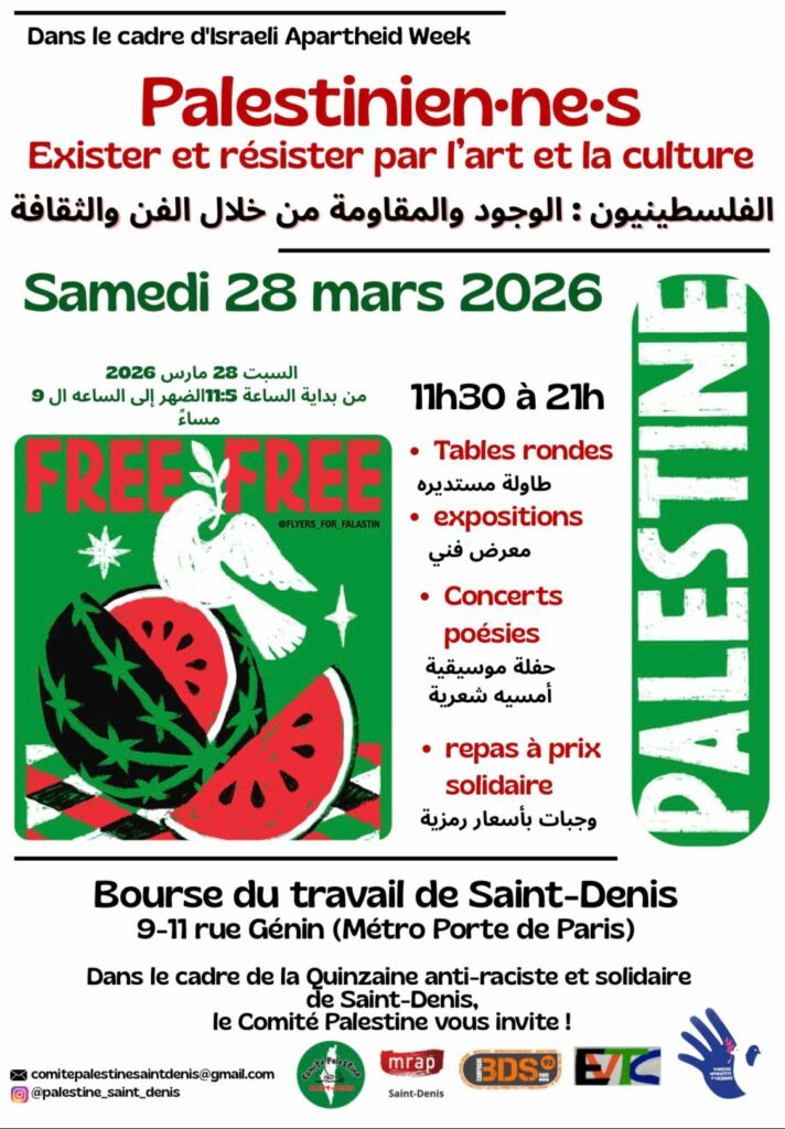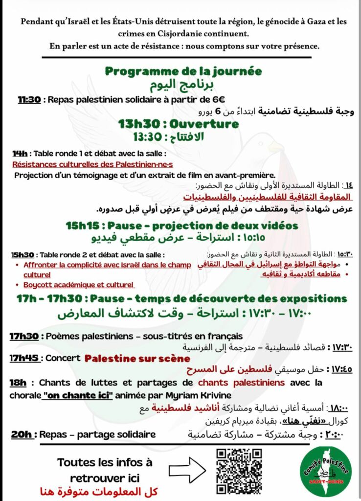 Une journée est organisée à la Bourse du travail de Saint-Denis pour se rencontrer, échanger, créer et résister ensemble : Palestinien·nes, exister et résister par l’art et la culture. Au programme : expositions, tables rondes et débats, concerts et poésie palestinienne, et repas palestinien solidaire.