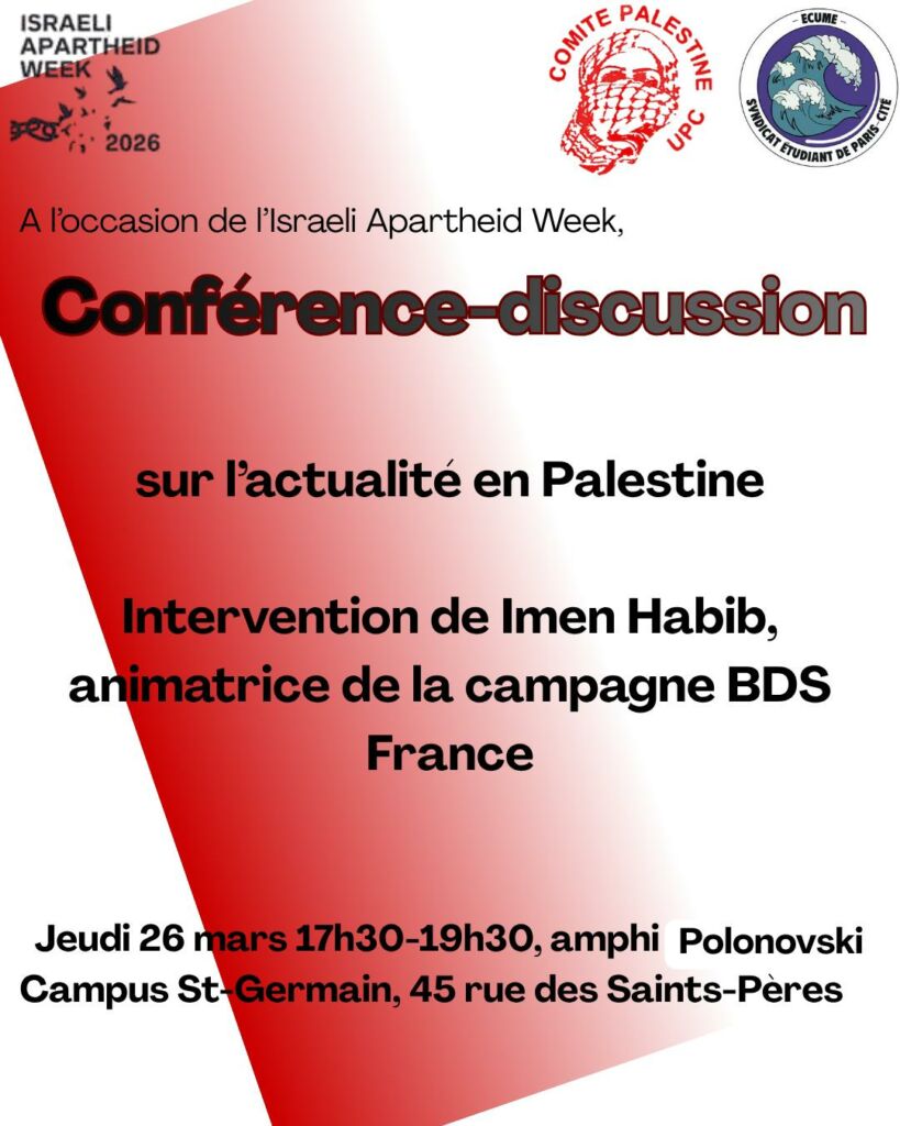 Venez assister à une conférence-discussion sur l’actualité en Palestine, avec l’intervention d’Imen Habib, animatrice de la Campagne BDS France. Rendez-vous à l’amphithéâtre Polonovski (2ème étage), site St-Germain (45 rue des saints-pères), de 17h30 à 19h30.