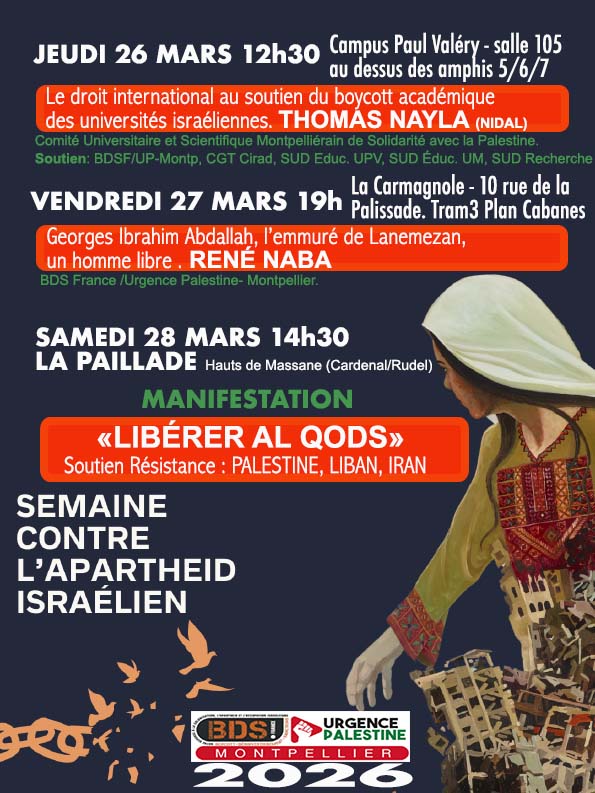 À Montpellier, 3 temps forts sont organisés pour la Semaine contre l’Apartheid Israélien : une conférence le jeudi 26 mars Le droit international au soutien du boycott académique des universités israéliennes avec Thomas Nayla, une conférence le vendredi 27 mars Georges Ibrahim Abdallah, l’emmuré de Lanemezan, un homme libre avec René Naba, ainsi qu’une manifestation le samedi 28 mars à 14h30.