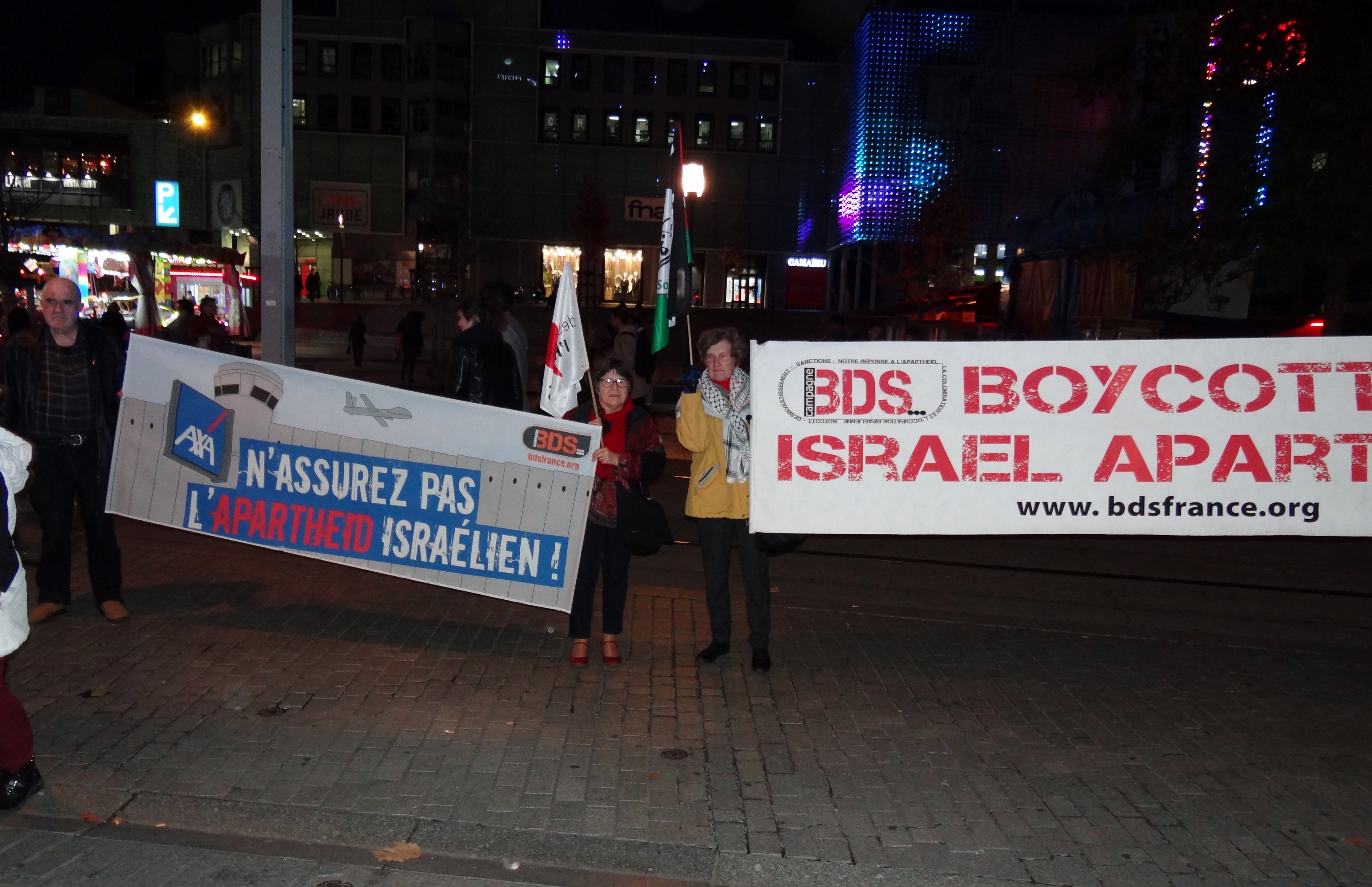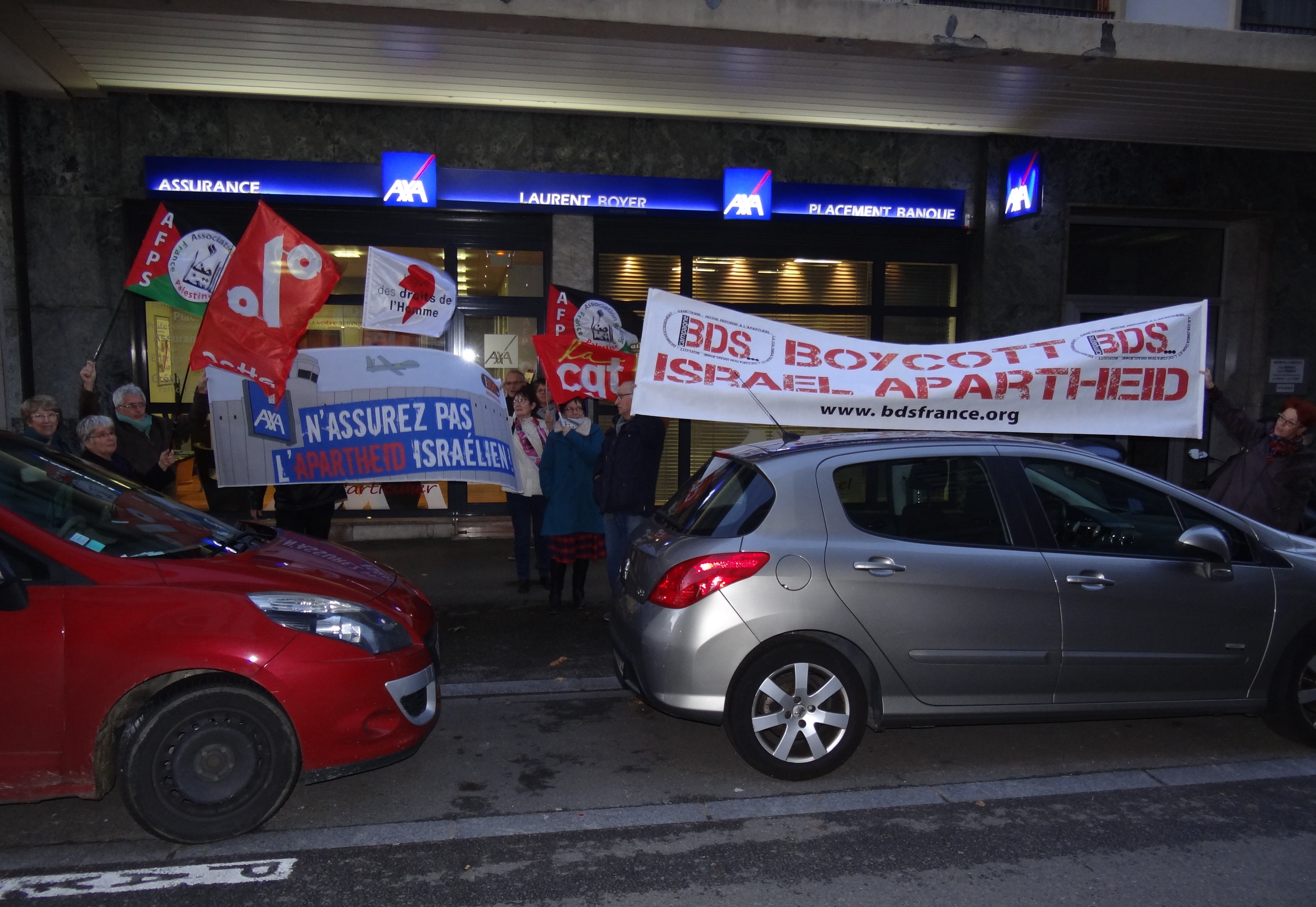 De 15 à 20 militants AFPS, Attac, BDSF, CGT, LDH, Solidaires se sont rassemblés le 6 décembre 2018 devant deux agences AXA du centre ville de Clermont-Ferrand, avec deux grandes banderoles, des drapeaux, des tracts cosignés par les 6 organisations , et des cartes postales à envoyer au président d’AXA France. Ils ont demandé à AXA de mettre fin à ses investissements dans les banques israéliennes complices de la colonisation des territoires palestiniens, et dans la firme Elbit Systems qui fournit l’armée israélienne pour ses opérations meurtrières à Gaza.