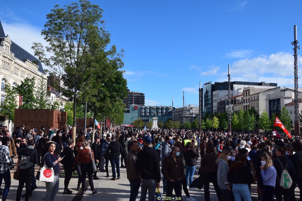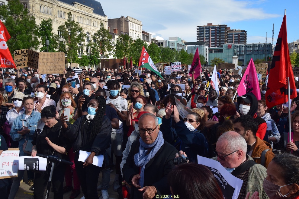 Environ 1.000 personnes, Blacks, Beurs, Blancs, … majoritairement des jeunes, et portant des masques, ont manifesté avec force et dynamisme leur soutien aux victimes des violences policières aux USA, en France et dans le monde, et fait entendre leur colère.