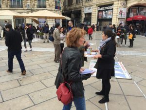 Même si le soleil n’a pas eu le courage de percer les nuages, la pluie s’est arrêtée et c’est sous un ciel couvert mais lumineux que le Comité BDS France 34 et ses amis ont « occupé » la Comédie. Le soutien des montpelliérains et montpelliéraines est toujours aussi actif et attentionné. Près de 2000 tracts ont été diffusés, des dizaines de signatures récoltés et de nombreux contacts notés.