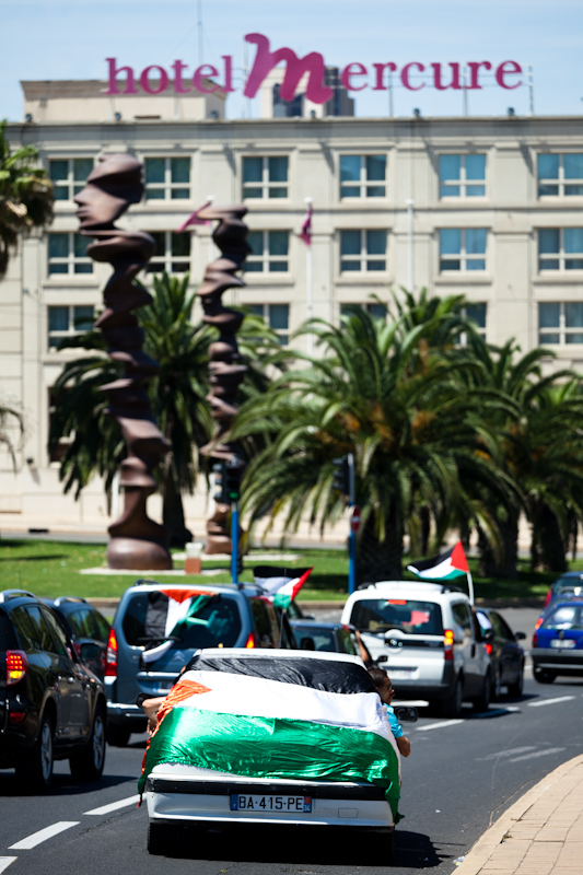 Nous étions une cinquantaine de jeunes, pour la plupart, ayant prit part à la manifestation en répondant à l’appel du comité BDSF34 et à celui du mouvement des quartiers populaires de Montpellier à l’initiative d’une « opération escargot » qui a amenée une vingtaine de voitures décorées aux couleurs de la Palestine et qui a fait son effet… Le cortège s’était formé le matin au départ de la Paillade pour ensuite se diriger en direction de Grammont via les quartiers du Petit-Bard, la Pergola et Paul-Valéry.