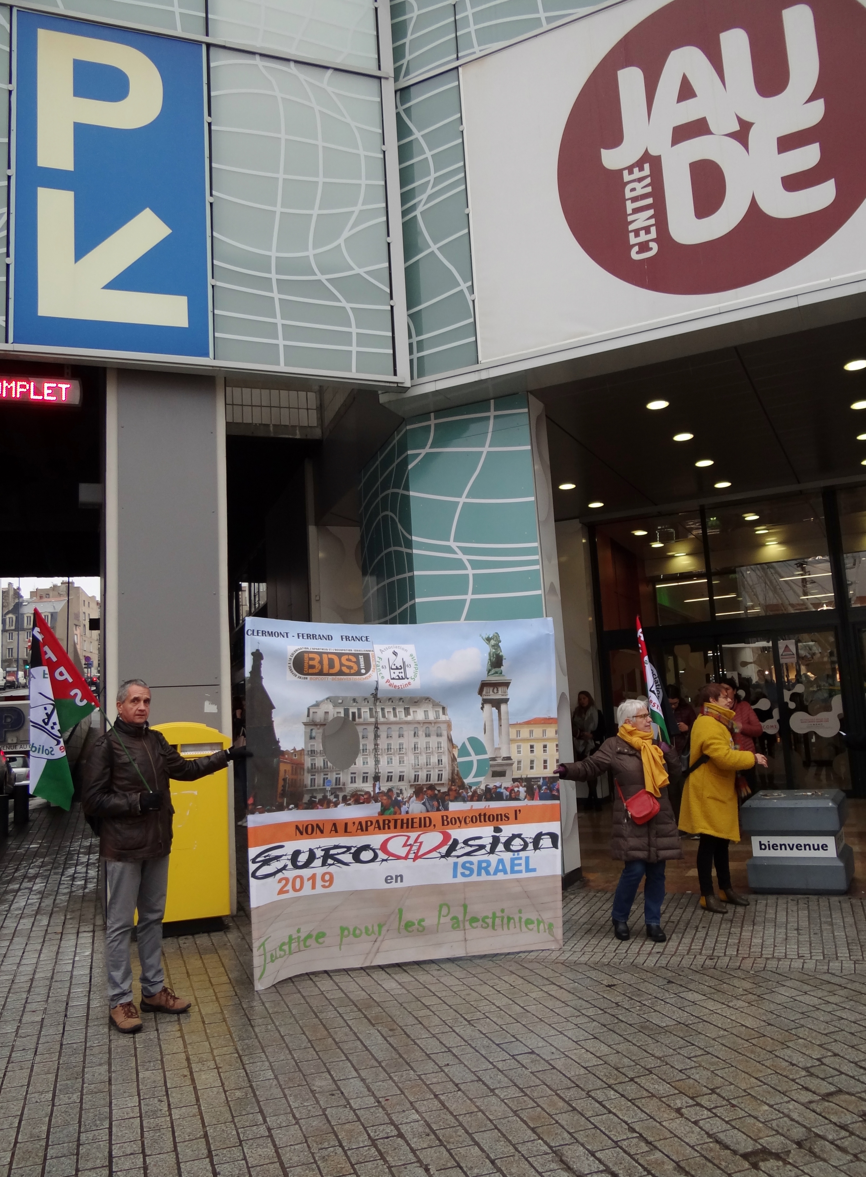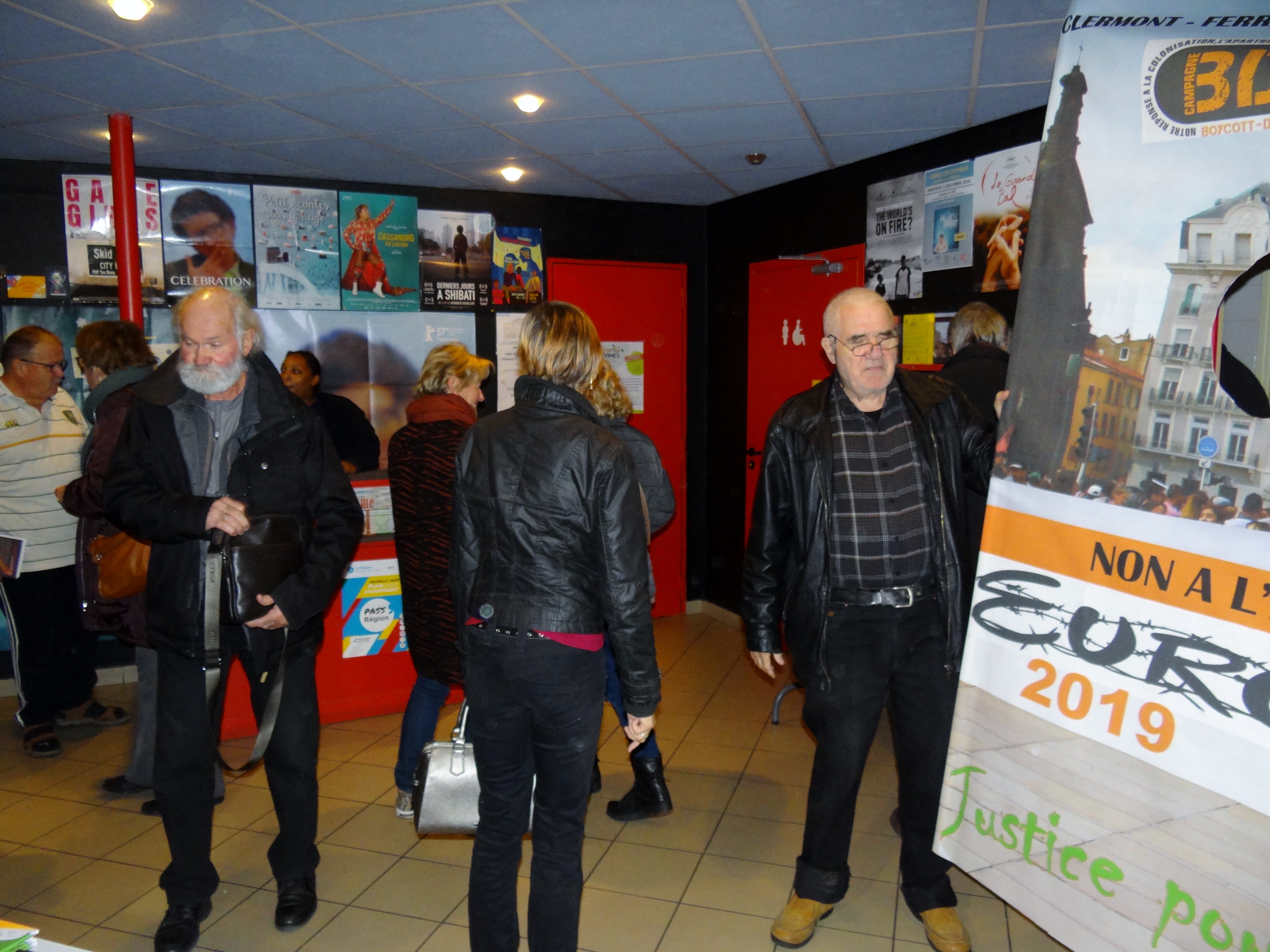 Ce décor auvergnat « passe-tête pour photos » a été inauguré avec succès le 30 novembre au cinéma le RIO lors du film « Mélancolie ouvrière » de Gérard Mordillat, qui a participé aux photos, et pleinement soutenu notre action lors du débat après le film, lui qui a signé l’appel des 140 artistes européens au boycott de l’Eurovision 2019 en Israël .