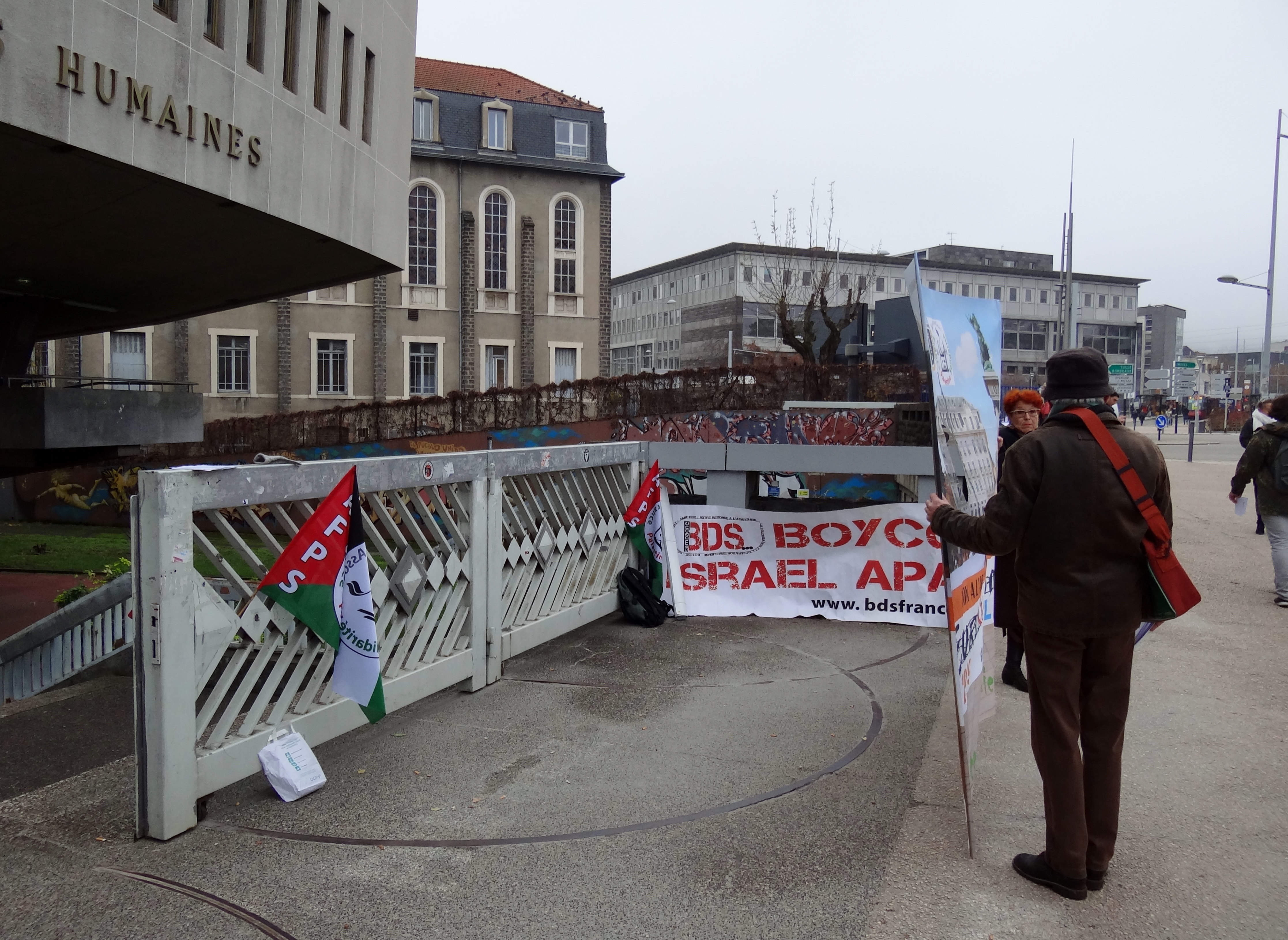 Cette action fut suivie par quatre rencontres de 15 militant-e-s AFPS et BDSF avec des citoyens clermontois-es du 13 au 16 décembre : devant l’entrée de la galerie commerciale Jaude en centre ville, sur le marché aux puces des Salins, devant le supermarché Auchan des quartiers nord, ainsi que devant la fac de lettres. Nous avons distribué 2.000 tracts qui expliquent la campagne et la pétition internationale à signer. Nous avons reçu de nombreux remerciements et encouragements, parfois très appuyés. Tous ne souhaitent pas voir leur photo sur les réseaux sociaux, mais plus de 70 personnes ont souhaité le faire. De nombreux jeunes (et moins jeunes) ont fait leurs propres selfies, sachant que nous ne photographions pas les mineurs.