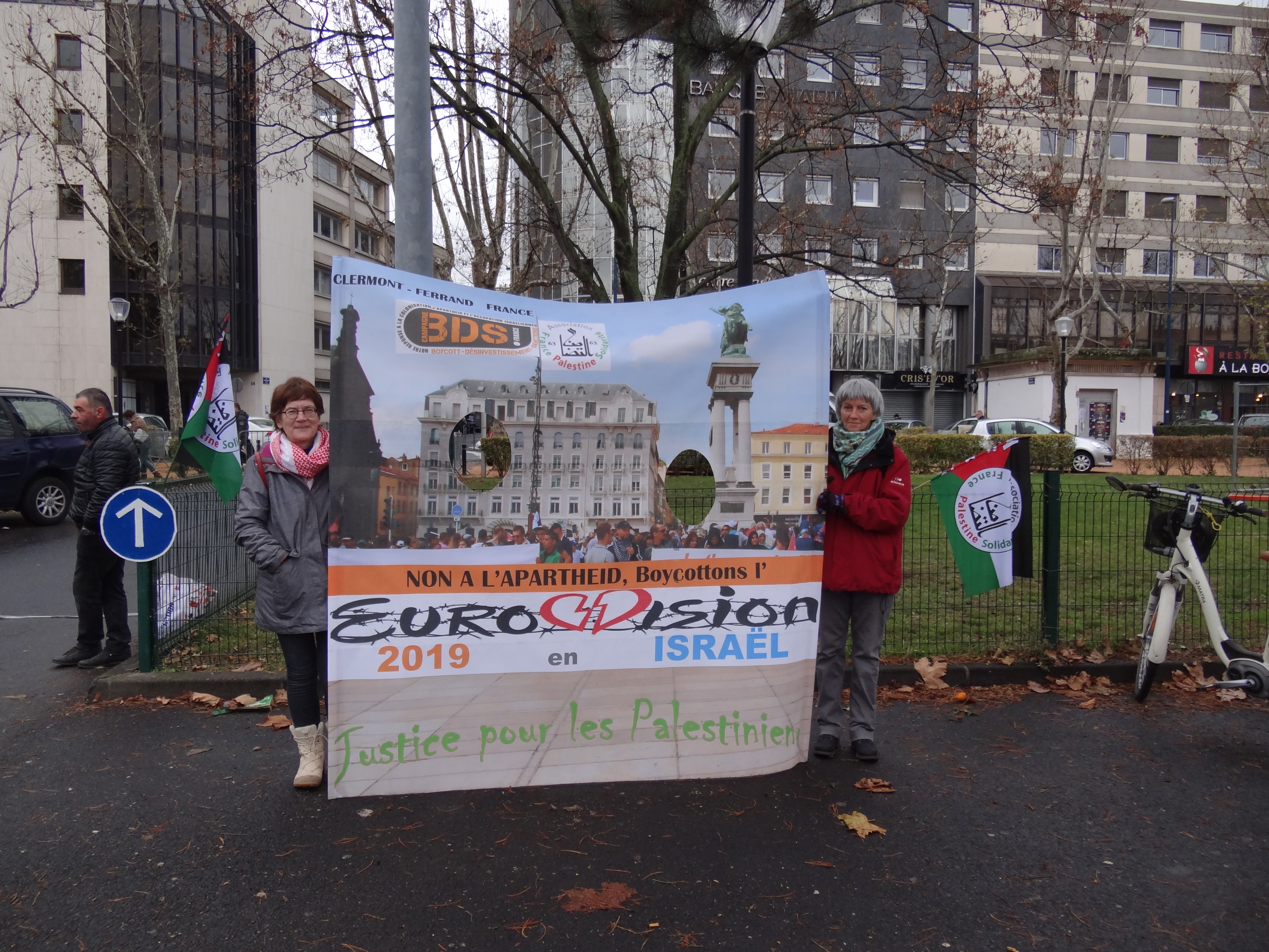 Nous complétons par ailleurs notre album photo par des photos de citoyen-ne-s tenant une pancarte #BoycottEurovision2019 (cf. image ci-dessous, à imprimer). Des militants AFPS 63 et du collectif BDS63, des militants rencontrés aux 20 ans d’ATTAC 63, y ont contribué. Nous arrivons à 160 personnes (dont un maire et deux conseillers municipaux) pour l’instant… ce n’est qu’un début…