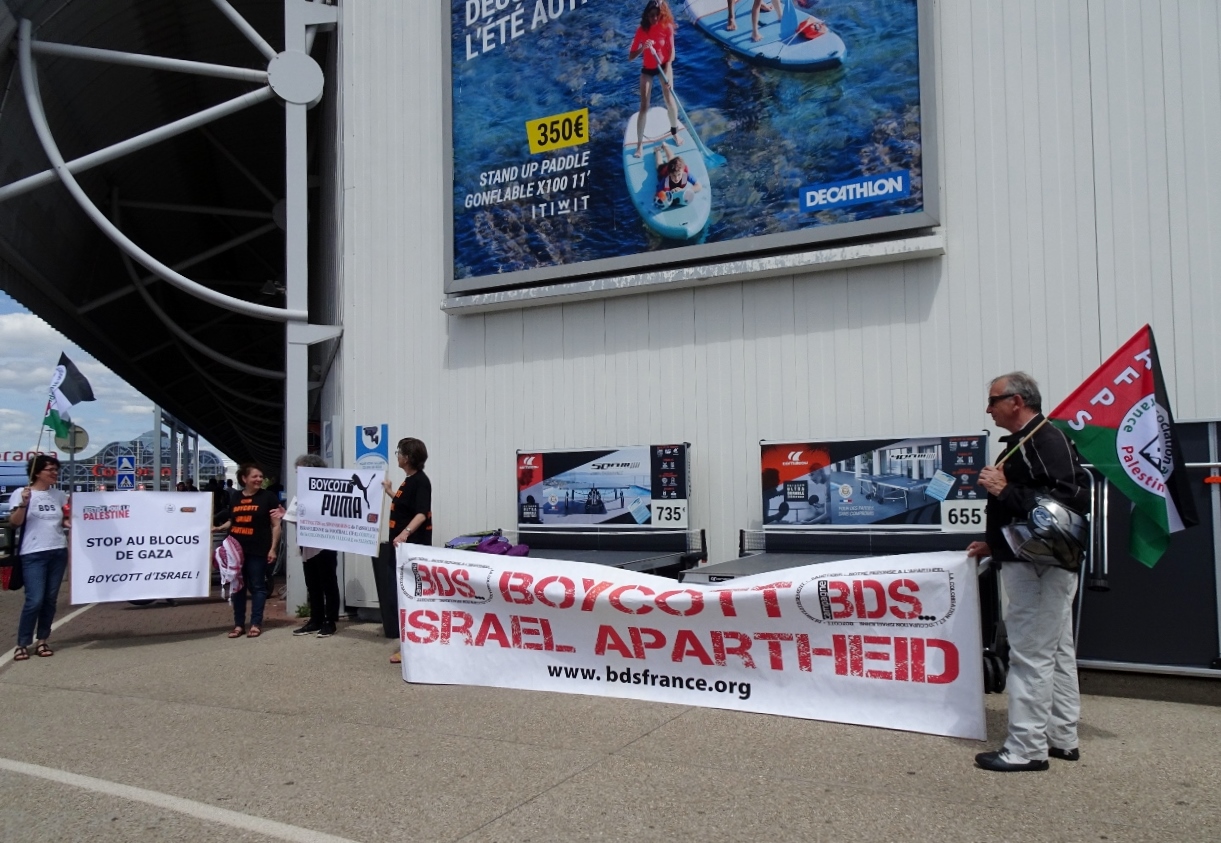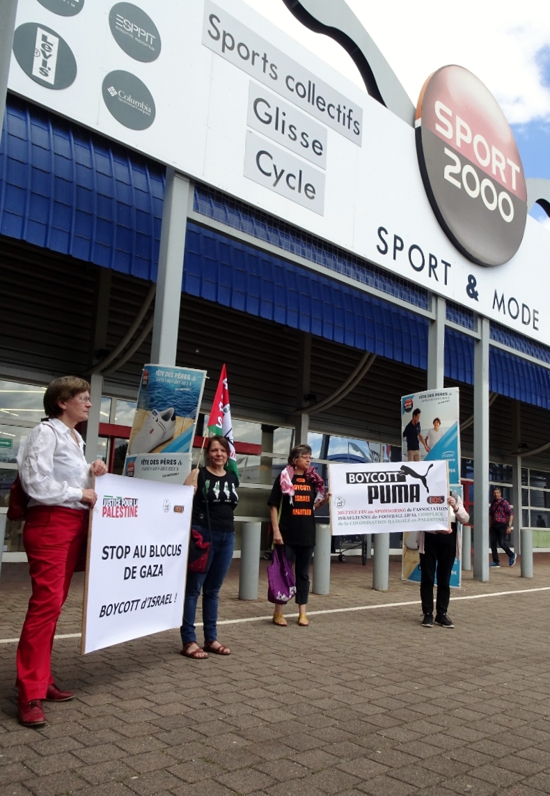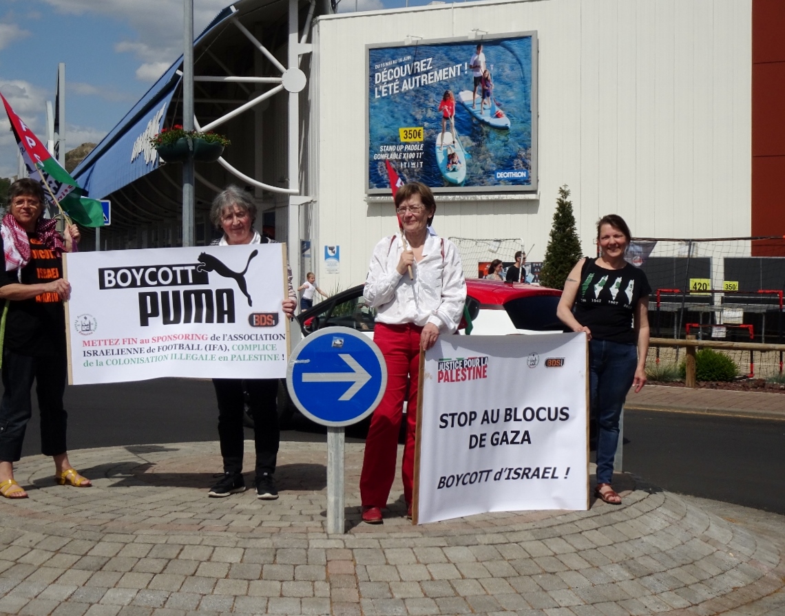 Une quinzaine de militant.e.s et sympathisant.e.s de l’AFPS 63 et de BDSF 63 ont déployé le 8 juin 2019 une banderole #BoycottPuma devant deux magasins Decathlon et Sport 2000 qui vendent du matériel @Puma dans une zone commerciale en périphérie de Clermont-Ferrand.