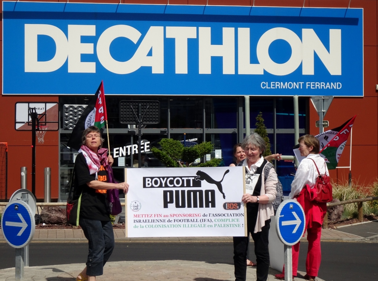 Les partisans des droits des Palestiniens appellent les consommateurs à #BoycottPuma à Clermont-Ferrand, en raison du soutien de @Puma à l’association israélienne de football, qui comprend des équipes installées dans des colonies de peuplement israéliennes illégales sur des terres palestiniennes.