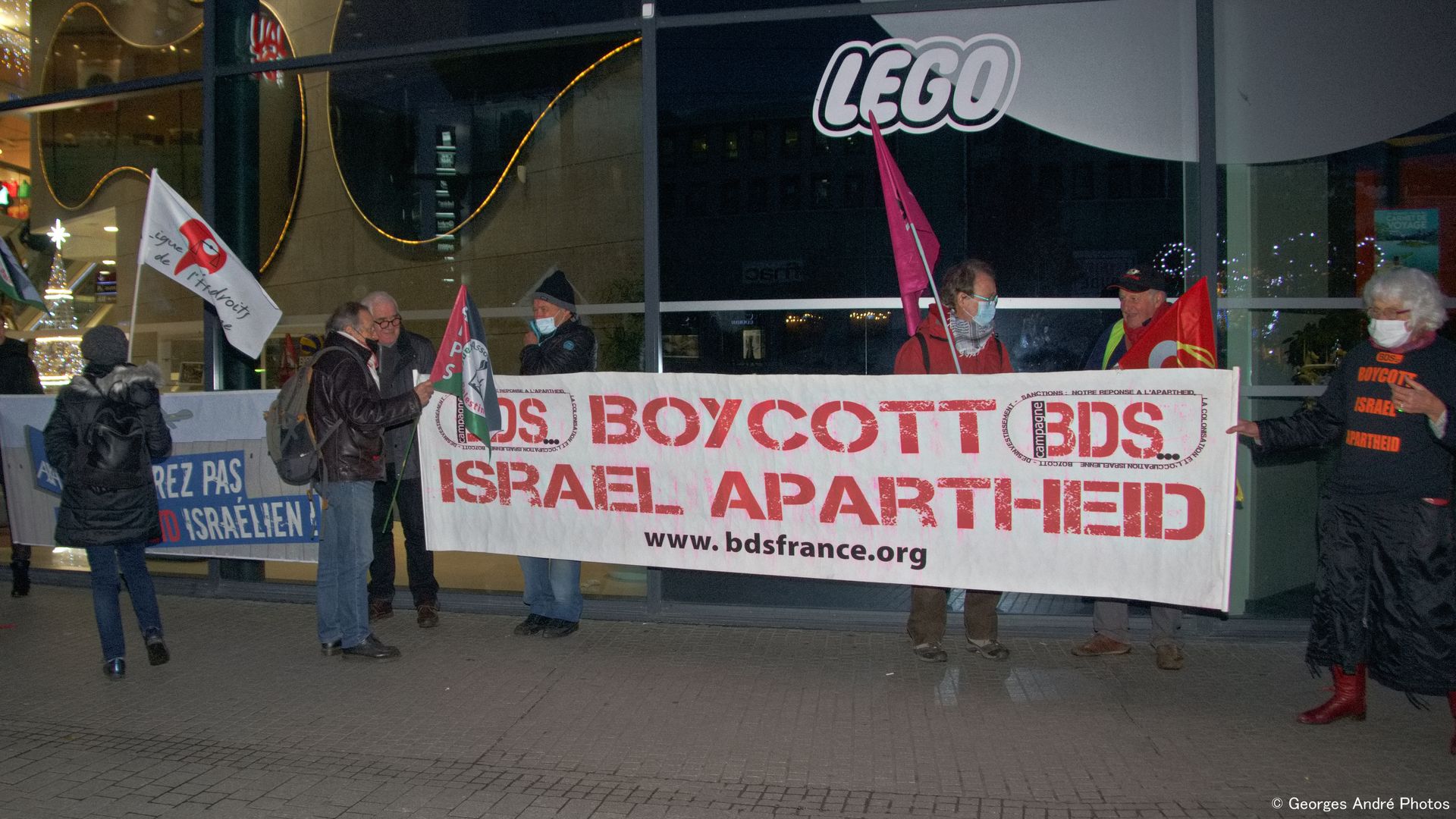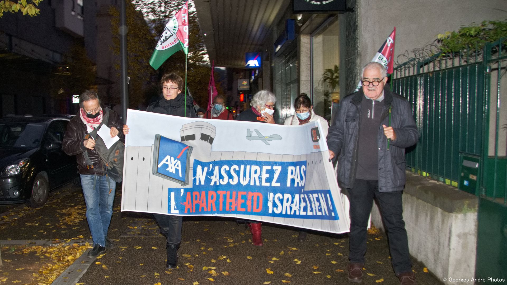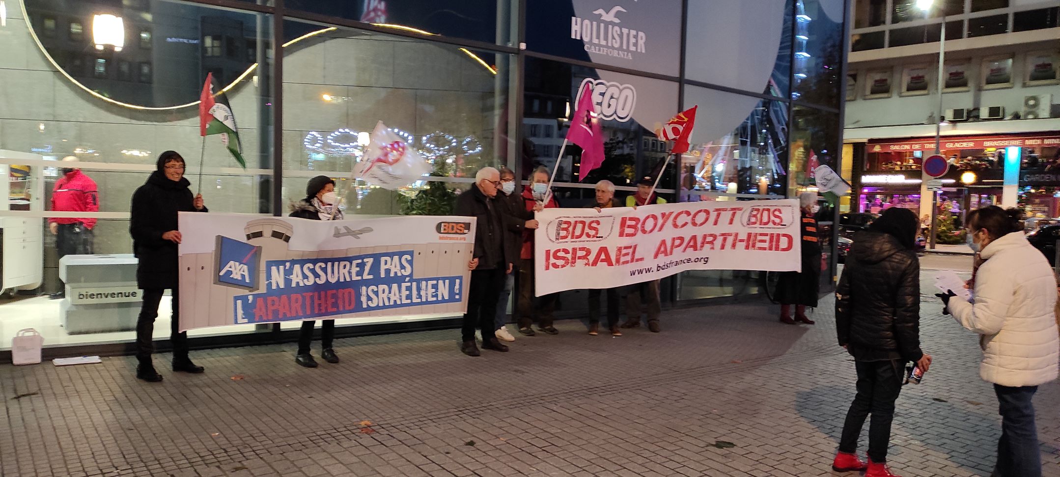 Malgré le froid et le vent, une quinzaine de militant-e-s et de sympathisants de la Coalition 63 « AXA STOP Assistance to Israeli Apartheid » (AFPS, Attac, BDSF, CGT, LDH, Solidaires), se sont rassemblés le 26 novembre 2021 devant une agence AXA du centre ville de Clermont-Ferrand, avec deux grandes banderoles, 6 drapeaux, un tract, et une pétition au DG d’AXA . Ils ont remis en boutique une lettre pour le Directeur de l’agence et la direction d’AXA , rappelant la campagne internationale qui depuis 3 ans met en avant les contradictions d’AXA avec les droits humains, ses premiers désinvestissements de l’industrie militaire israélienne, et la poursuite de la campagne jusqu’à un désinvestissement complet des entreprises complices de la colonisation en Palestine.