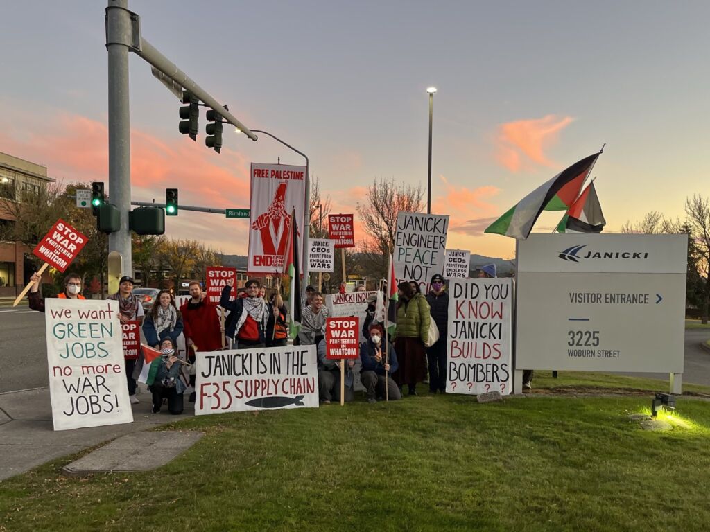 Des militant·es se sont rassemblé·es devant l’usine de Janicki Industries pour exiger la fin de ses contrats avec Lockheed Martin, le fabricant des avions.