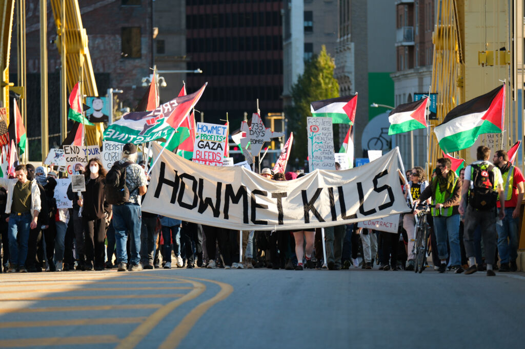 Des militant·es ont défilé dans le centre-ville de Pittsburgh, en Pennsylvanie, où se trouve le siège social de Howmet Aerospace qui fournit à Lockheed Martin des pièces en titane et en aluminium indispensables à la construction des F-35.
