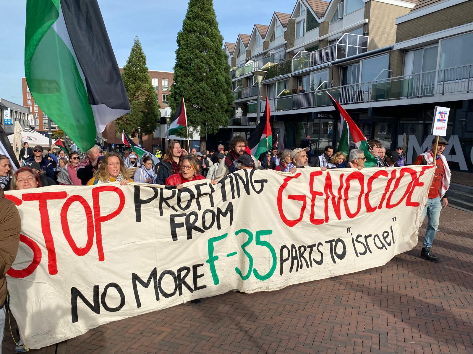 Des manifestant·es ont défilé contre GKN Fokker à Pappendracht, qui produit des portes et du matériel électrique pour les F-35.