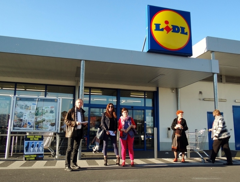 Le vendredi 17 mars, de 16h30 à 19h15, quinze militant-e-s de la Coalition BDS 63 (AFPS, BDSF, PCF, NPA, ATTAC, LDH, CGT, RESF) et 5 élu-e-s de deux municipalités : Clermont (3 élus PCF, deux adjoints au maire s’étant excusés : un élu EELV et un élu PCF, mobilisé sur une action d’ouvriers en grève de l’usine CANDIA) et Beaumont (une élue PCF et un d’IDEES Pour Beaumont) se sont rassemblés devant deux magasins LIDL à Clermont-Oradou et à Beaumont-Masage (photos jointes) pour distribuer près de 300 exemplaires d’un tract (ci-joint) expliquant aux clients l’importance du boycott des produits de la colonisation israélienne, et en particulier des fruits et légumes commercialisés par la société Mehadrin en provenance des colonies illégales en territoire palestinien occupé (voir à ce sujet la brochure « Cultures d’injustice » publiée par 16 ONG palestiniennes en 2013, ci-jointe Cultures injustice_16 ONG palestine 2013).