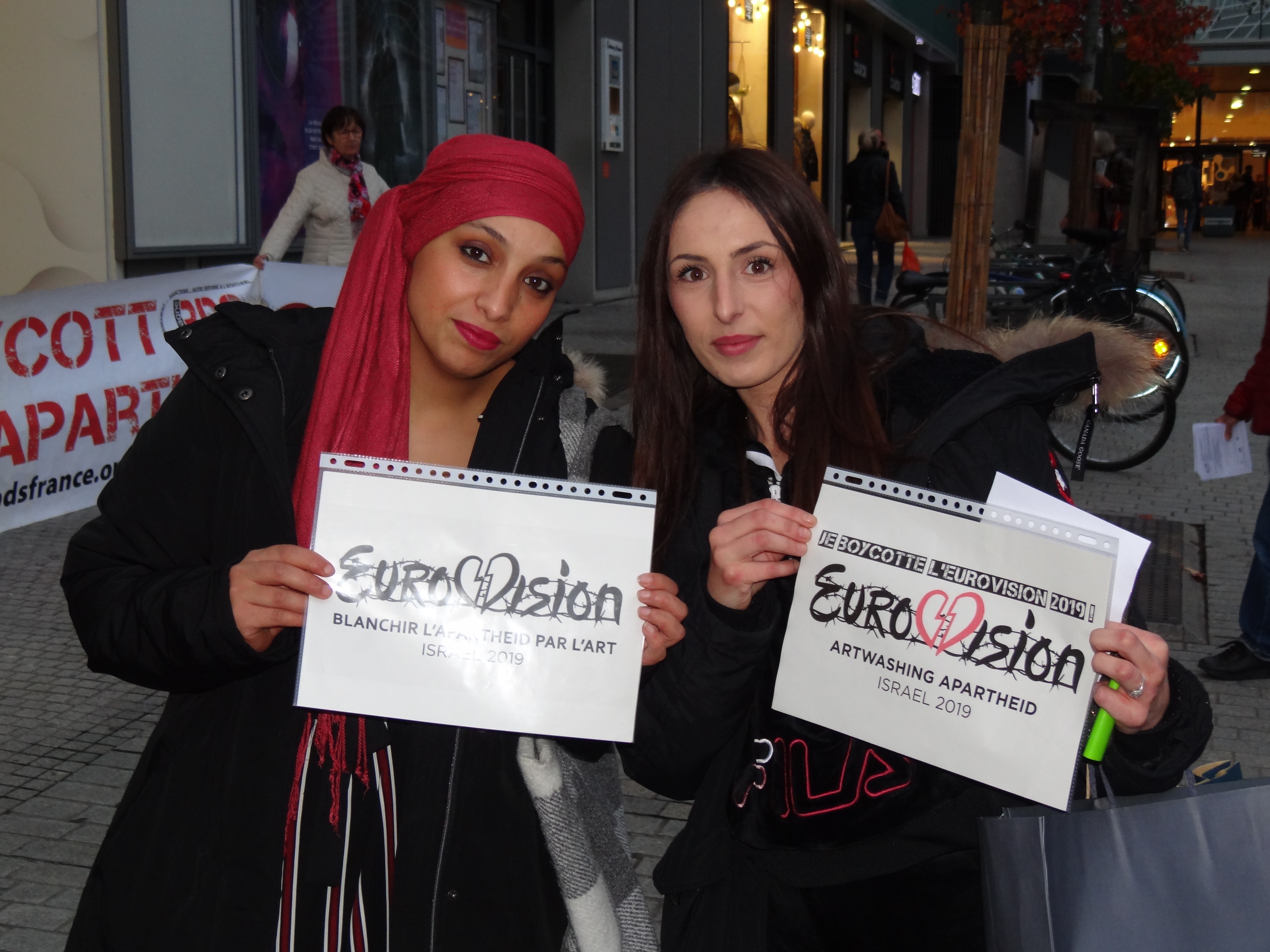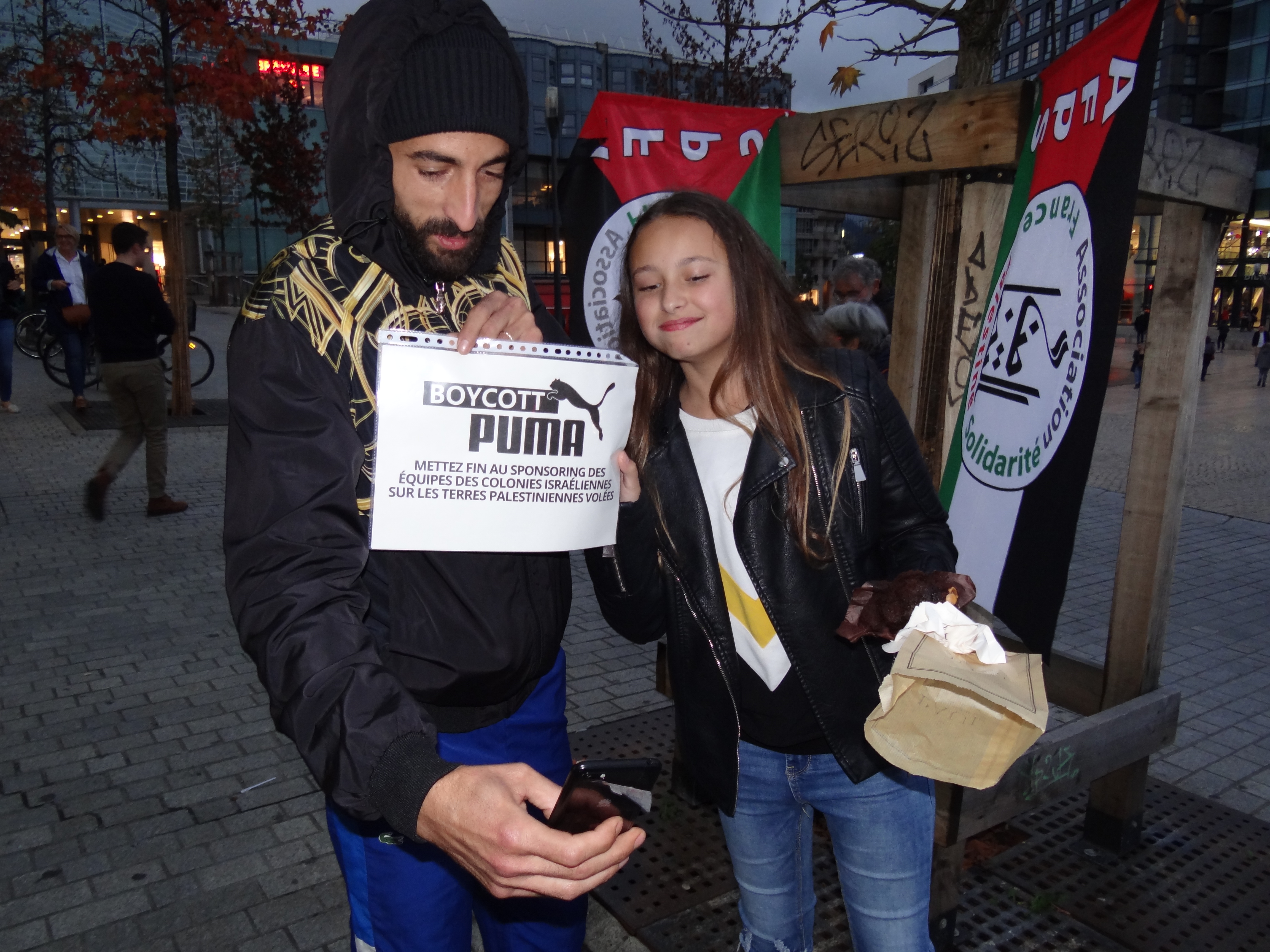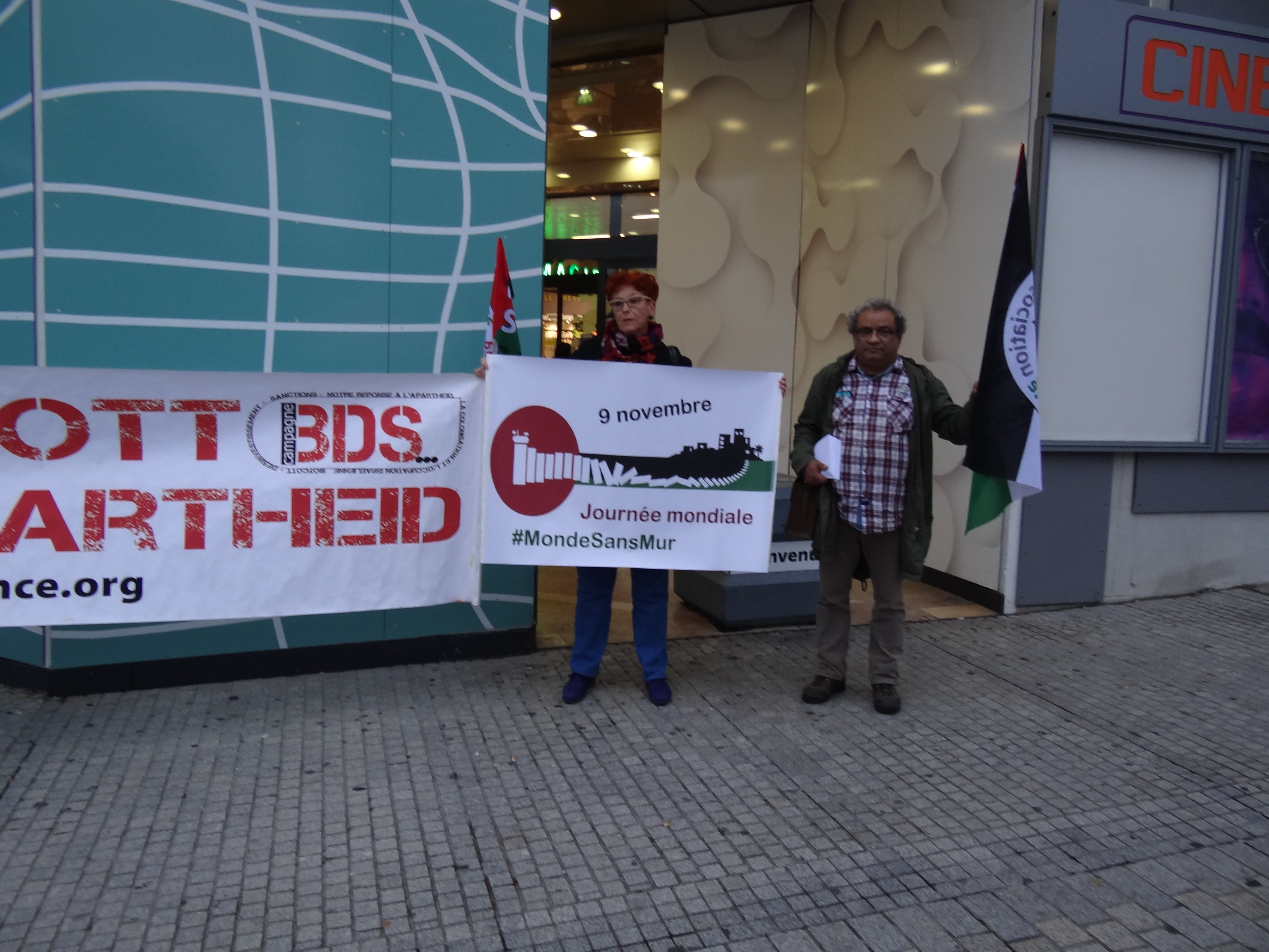 Pour répondre au mouvement palestinien « Stop the Wall » de faire du 9 novembre une « Journée Mondiale Un Monde Sans Mur », une dizaine de militants AFPS et de la Coalition BDS 63 ont déployé le 13 novembre, durant près de deux heures, des drapeaux et deux banderoles : Contre le Mur, et Pour BDS, devant l’entrée principale du Centre commercial Jaude à Clermont-Ferrand. Ils ont distribué, sur le pourtour de la place de Jaude et à l’arrêt du tramway environ 800 tracts, contre le mur, pour BDS et annonçant la conférence sur Jérusalem, ce même soir à la fac de lettres. Les passants, souvent des jeunes, nous ont pour la plupart réservé un très bon accueil et des remerciements. Certain-e-s ont accepté avec enthousiasme de se faire prendre en photo avec les pancartes #BoycottEurovision2019, et #BoycottPuma (ce qui porte nos deux albums photos à 25 et 28 participants, respectivement). Une promesse d’adhésion.