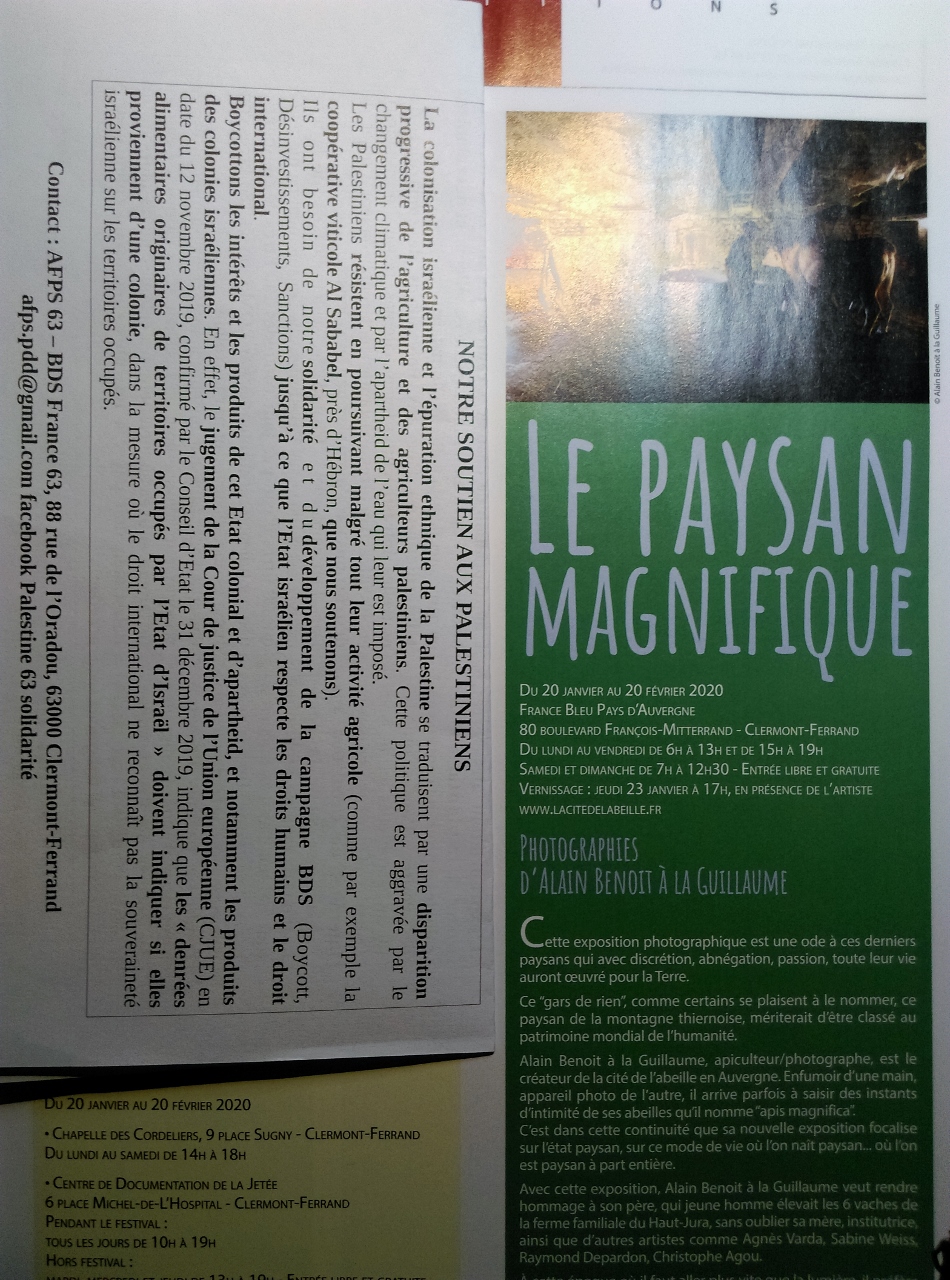 1.000 tracts sur les paysans (rappelant l’histoire et la situation actuelle des paysans palestiniens, et distribués lors de 4 séances sur le thème « Les mondes paysans » du festival)