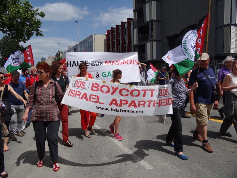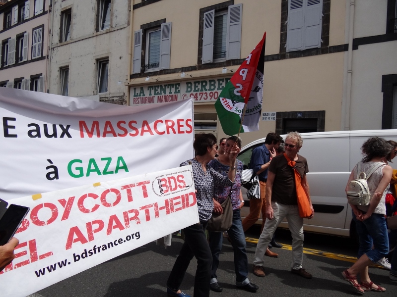 Dans le défilé parti vers 14h30, une dizaine de militants AFPS et BDSF 63 portant une banderole « Halte aux massacres à Gaza » et une banderole BDS et 6 drapeaux AFPS, ont formé le noyau d’un cortège Gaza-BDS, accompagné d’une demi douzaine de sympathisant-e-s et d’autres citoyen-ne-s, et par les nombreux photographes amateurs couvrant les banderoles. Les mots d’ordre « Israël assassin, Macron complice » et « Boycott Israël, État criminel » ont été scandés dans les rues passantes. En tête de manif, une camarade UNEF a aussi brandi un grand drapeau palestinien durant tout le trajet.