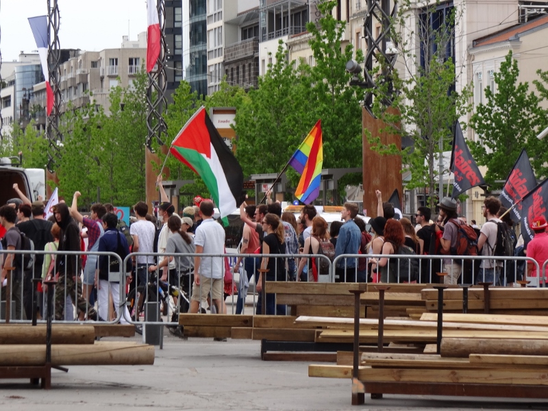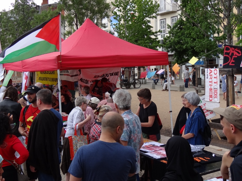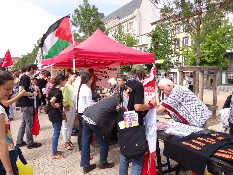 Lors de l’arrivée des 3.000 manifestants environ, place de Jaude vers 16h, nous avons rejoint le forum des luttes, monté un grand stand avec table de presse et vente de produits, près du podium des prises de parole et des chanteurs. De nombreux manifestants mais aussi des passants de cette place très animée le samedi se sont pressés pour signer la pétition contre l’accord UE-Israël, et très vite nous avons épuisé la quasi-totalité de notre stock de bouteilles d’huile d’olive, T-shirts BDSF, keffiehs (environ 300 euros de ventes), carte postales pour Salah Hamouri, stickers pour carte Vitale… juste avant l’orage vers 17 h ! De belles discussions et des prises de contacts, et des retrouvailles avec des manifestants du 19 mai pour Gaza, ont aussi enrichi cette après midi dans la marée montante.