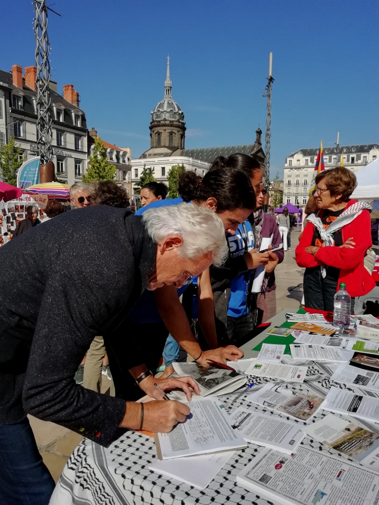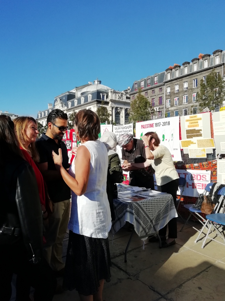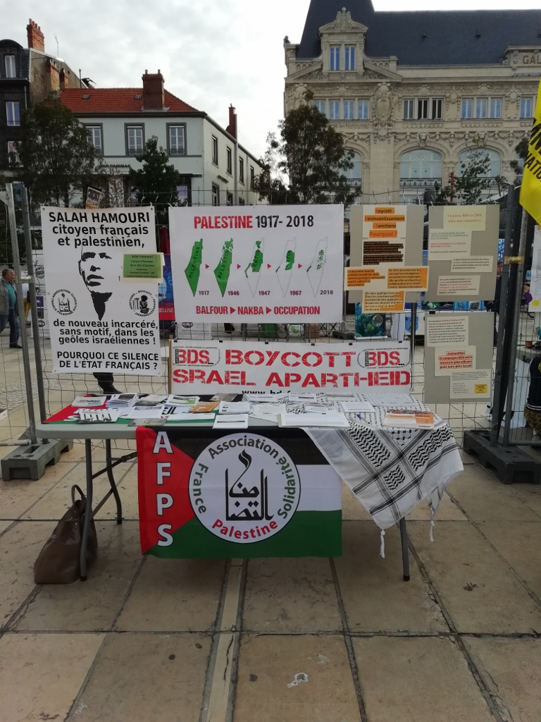 Samedi 22 septembre l’AFPS 63 était présente, comme chaque année, au forum des associations de la ville de Clermont-Ferrand avec un stand axé sur les prisonniers, au travers du cas de Salah Hamouri qui va être fait citoyen d’honneur par la mairie d’Aubière le 5 octobre, et sur BDS en mettant en avant l’absolue nécessité de cette campagne. Un public nombreux était présent, autour d’environ 200 stands d’associations très diverses.