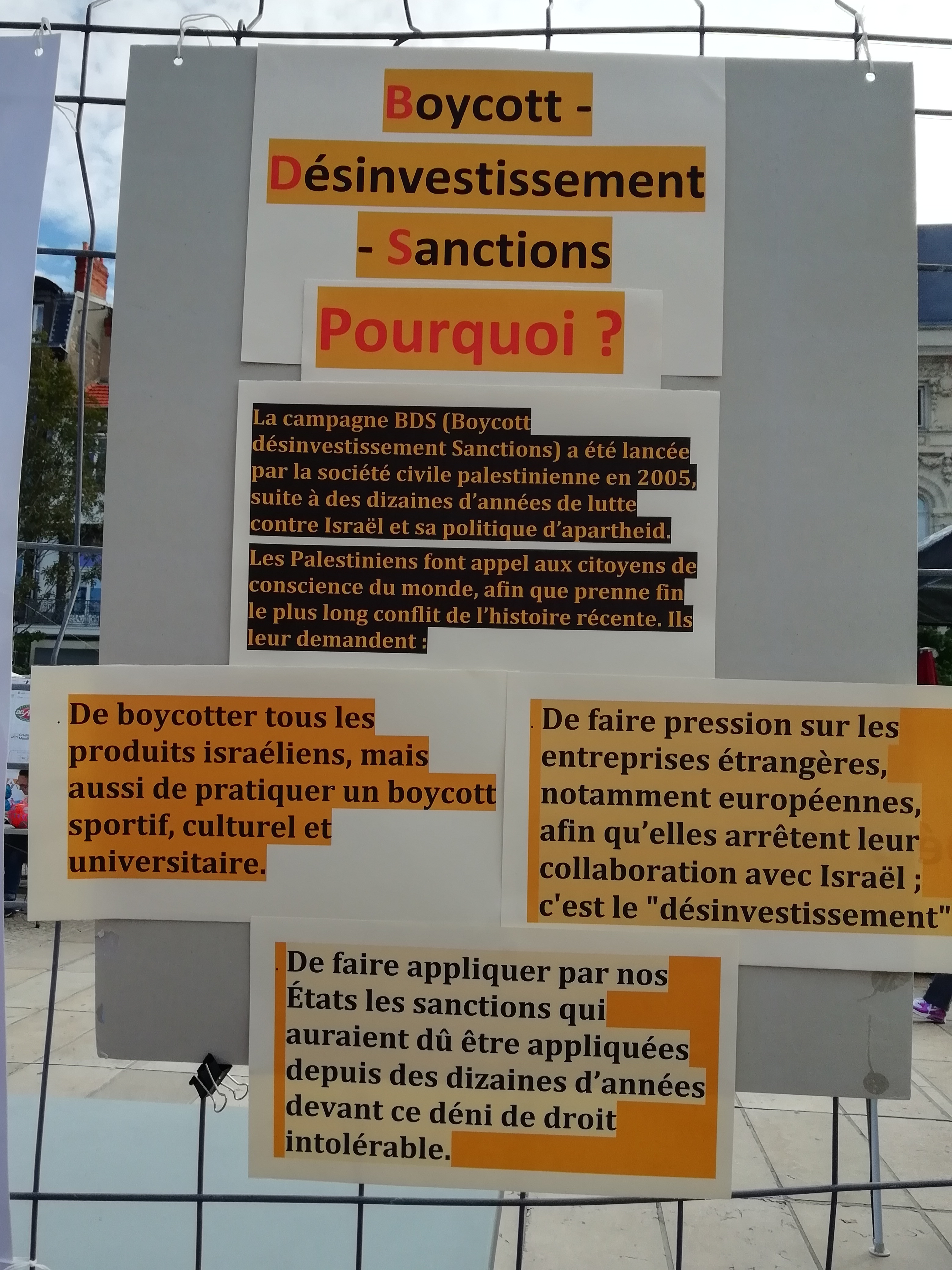 Des échanges intéressants avec le public ont eu lieu, les différents panneaux ont retenu l’attention. Avec les personnes qui connaissent BDS nous avons insisté sur les avancées de la campagne notamment sur l’aspect culturel qui ternit l’image d’Israël. Pour ceux qui ne connaissent pas nous avons présenté BDS comme étant une des actions centrales de notre groupe.