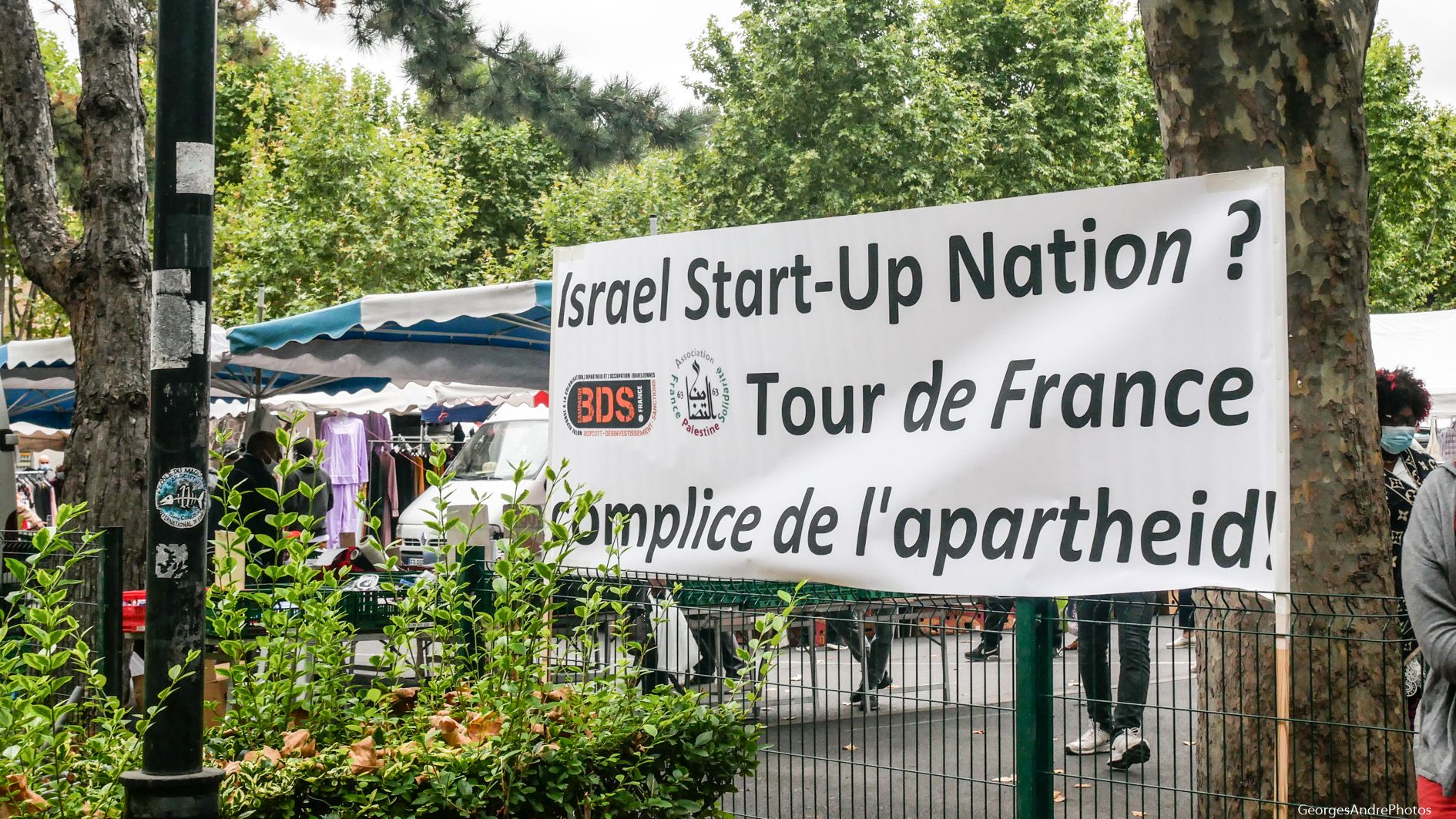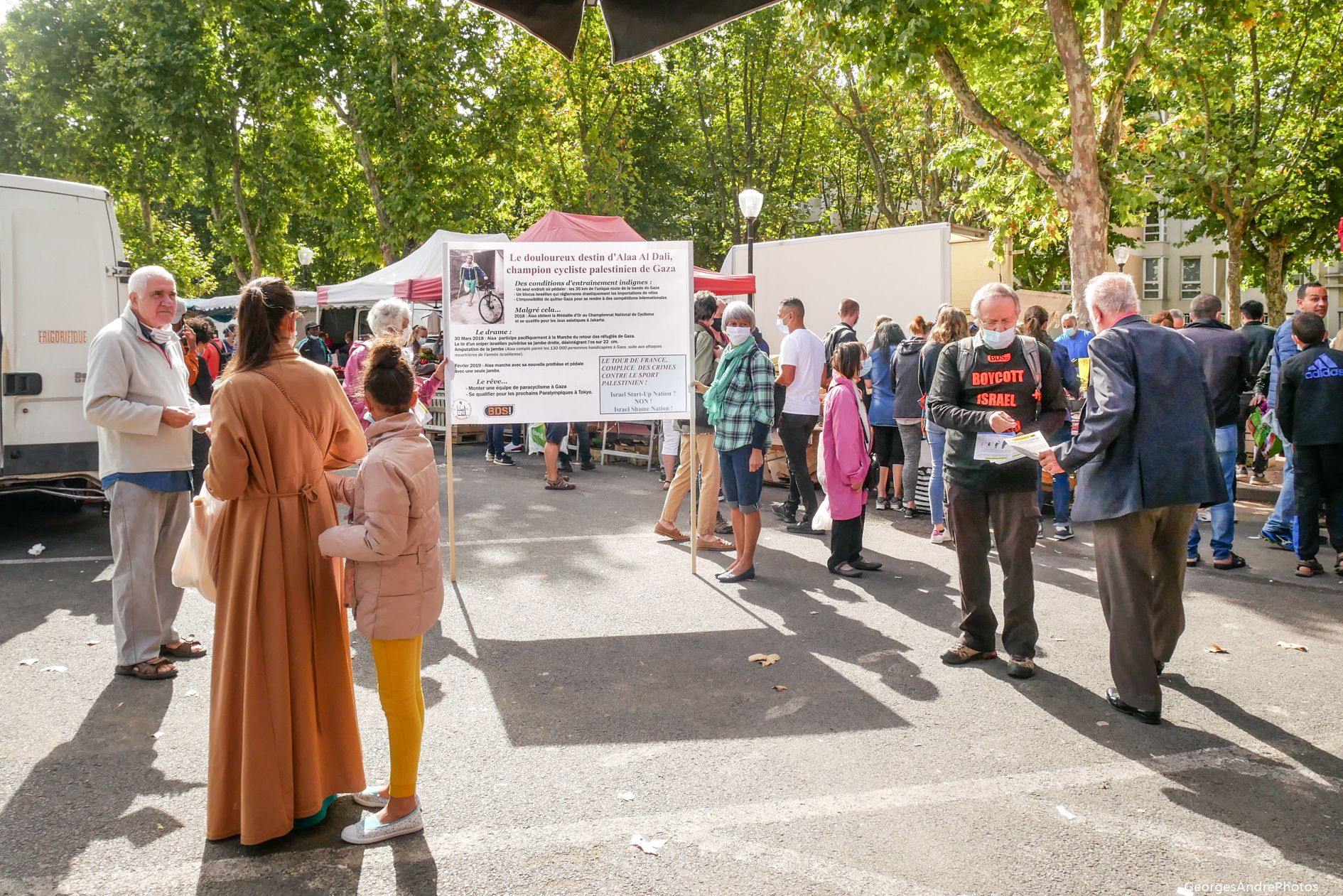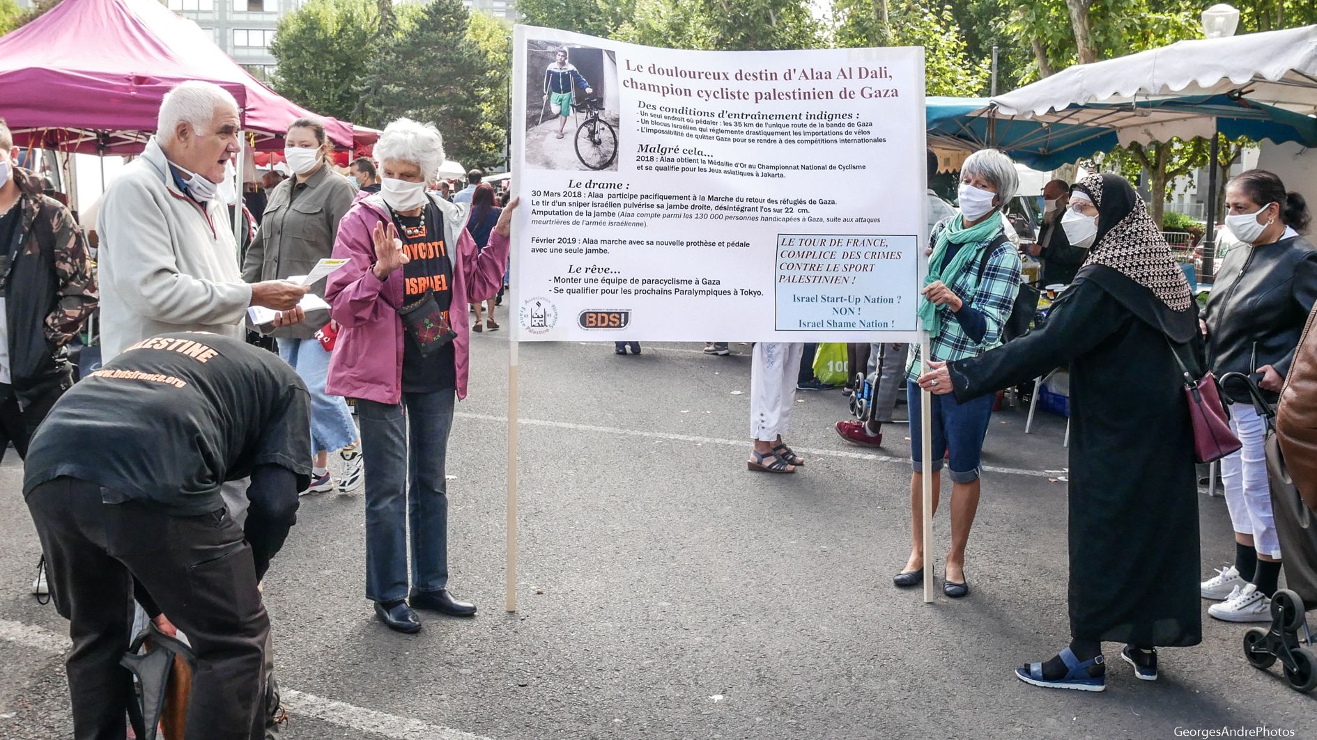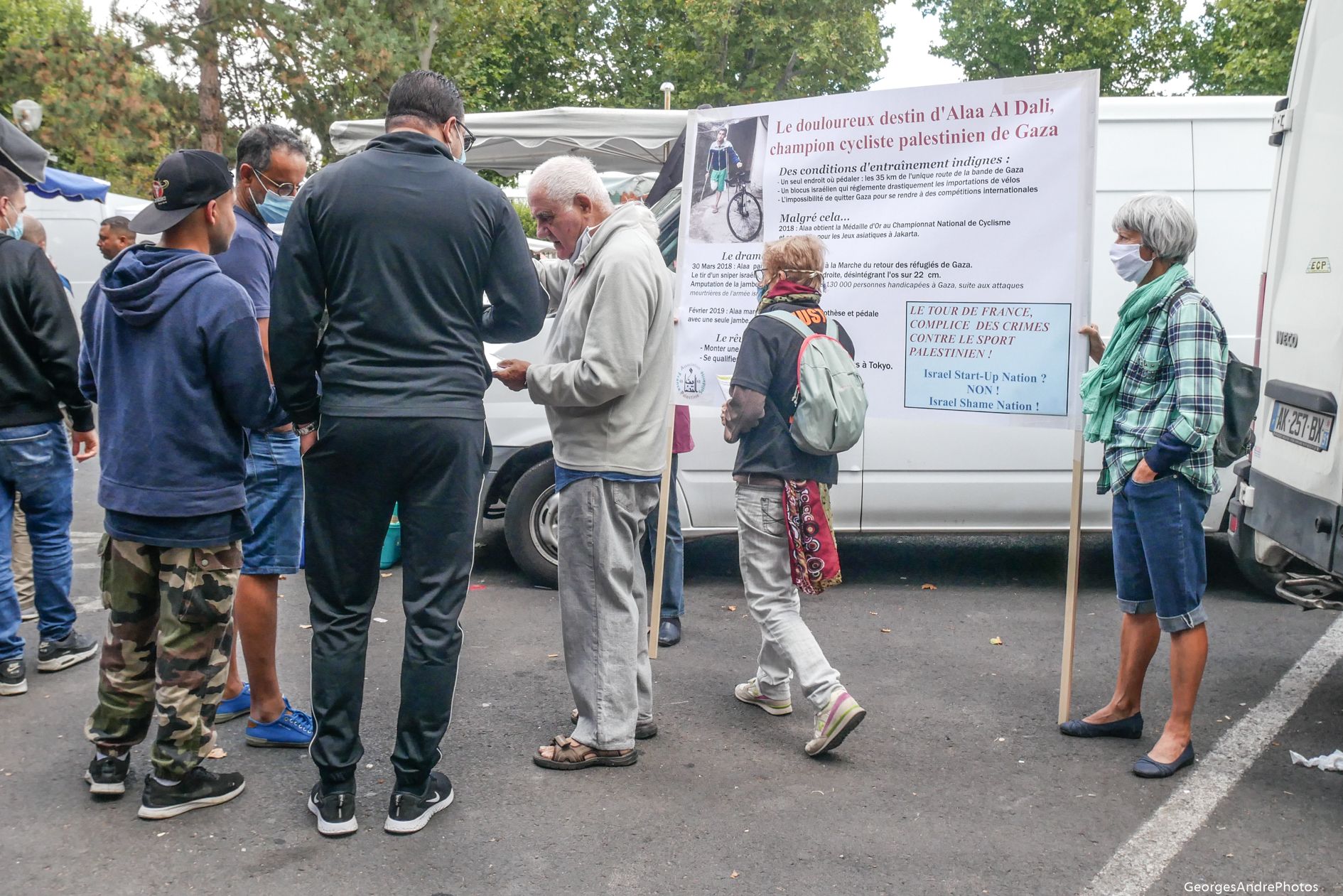 Treize militant-e-s de l’AFPS et de la Coalition BDS 63 ont déployé au marché aux puces des Salins, le 30 août 2020, une grande banderole « Israel Start-up Nation ? Tour de France complice de l’apartheid ! », fixée sur la grille d’une des entrées très passantes du marché. Ils sont aussi exposé une affiche mobile, sur le champion cycliste de Gaza amputé suite à un tir de soldat israélien, qui a suscité de nombreuses discussions avec les passants. Une déambulation avec l’affiche, précédée par 3 « tracteurs », a aussi été bien visible (voir la video).