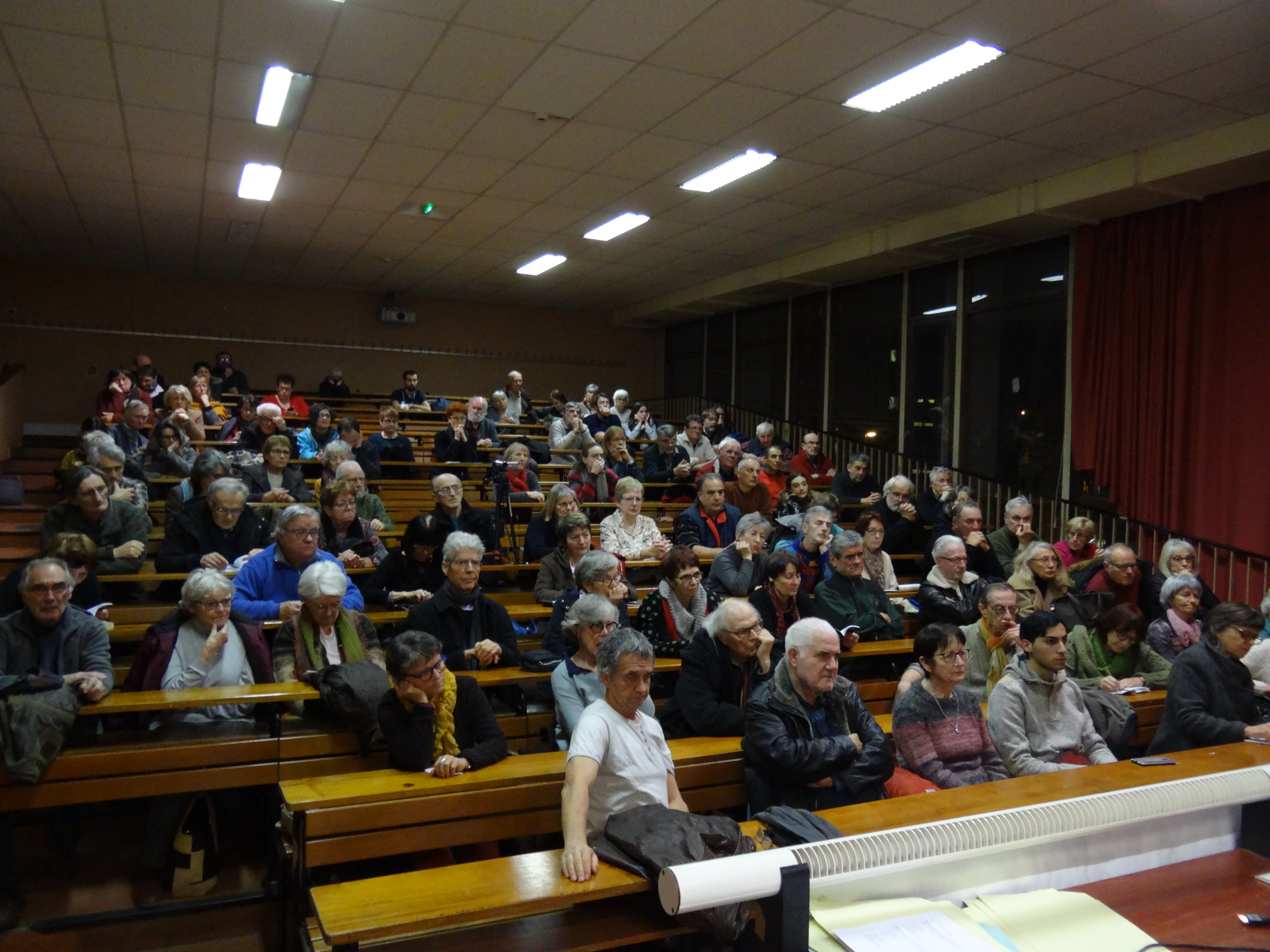 L’amphi 120 de la fac de lettres de Clermont-Fd était presque plein (environ 100 personnes) le 12 février 2019 pour accueillir Michel Warschawski, dans le cadre de sa tournée en France, organisée par l’UJFP.
