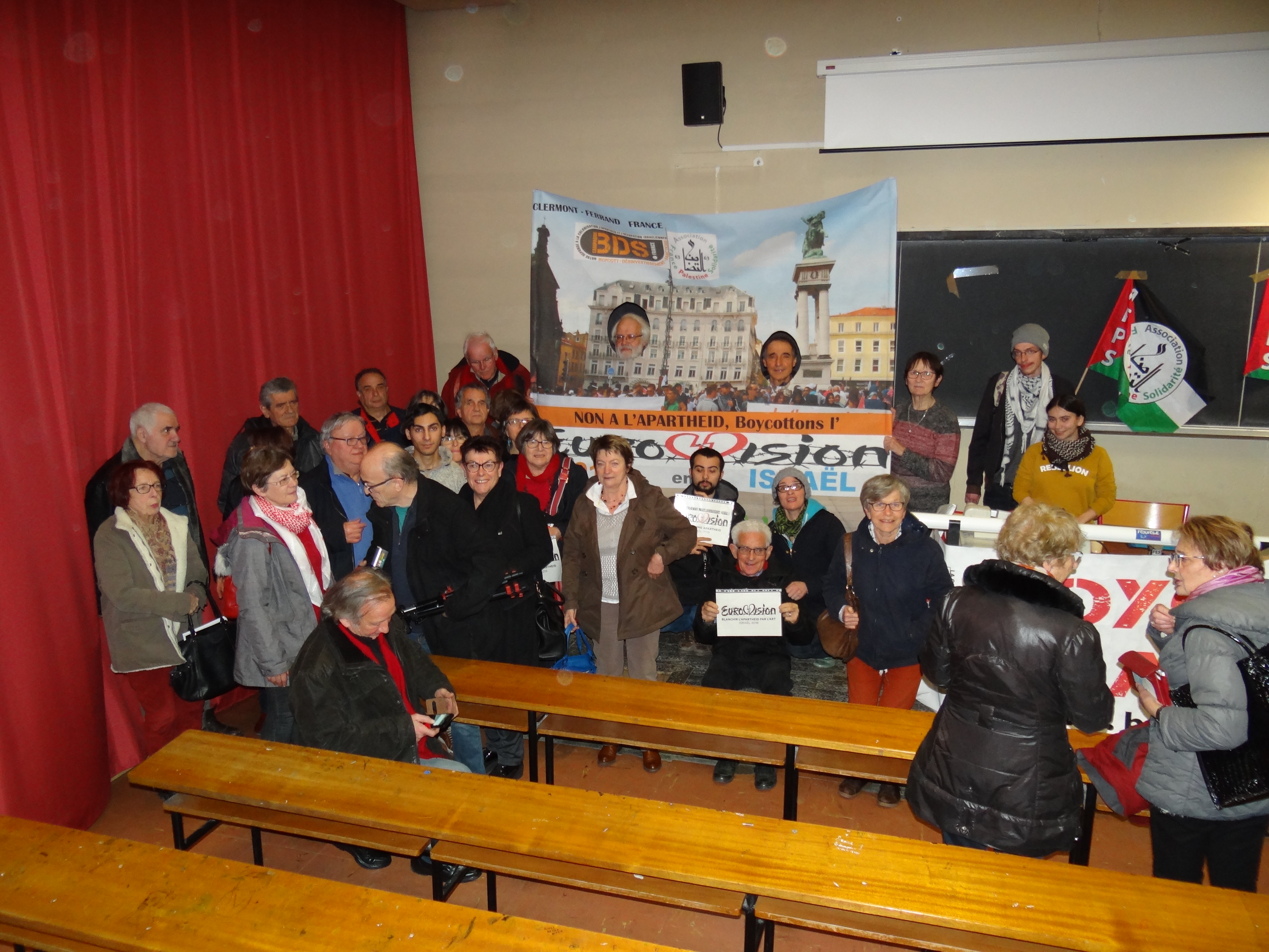 Une partie de l’assemblée s’est ensuite réunie au pied de l’estrade, devant notre décor auvergnat pour le boycott de l’Eurovision 2019 en Israël, pour une belle photo collective à mettre sur notre album facebook.
