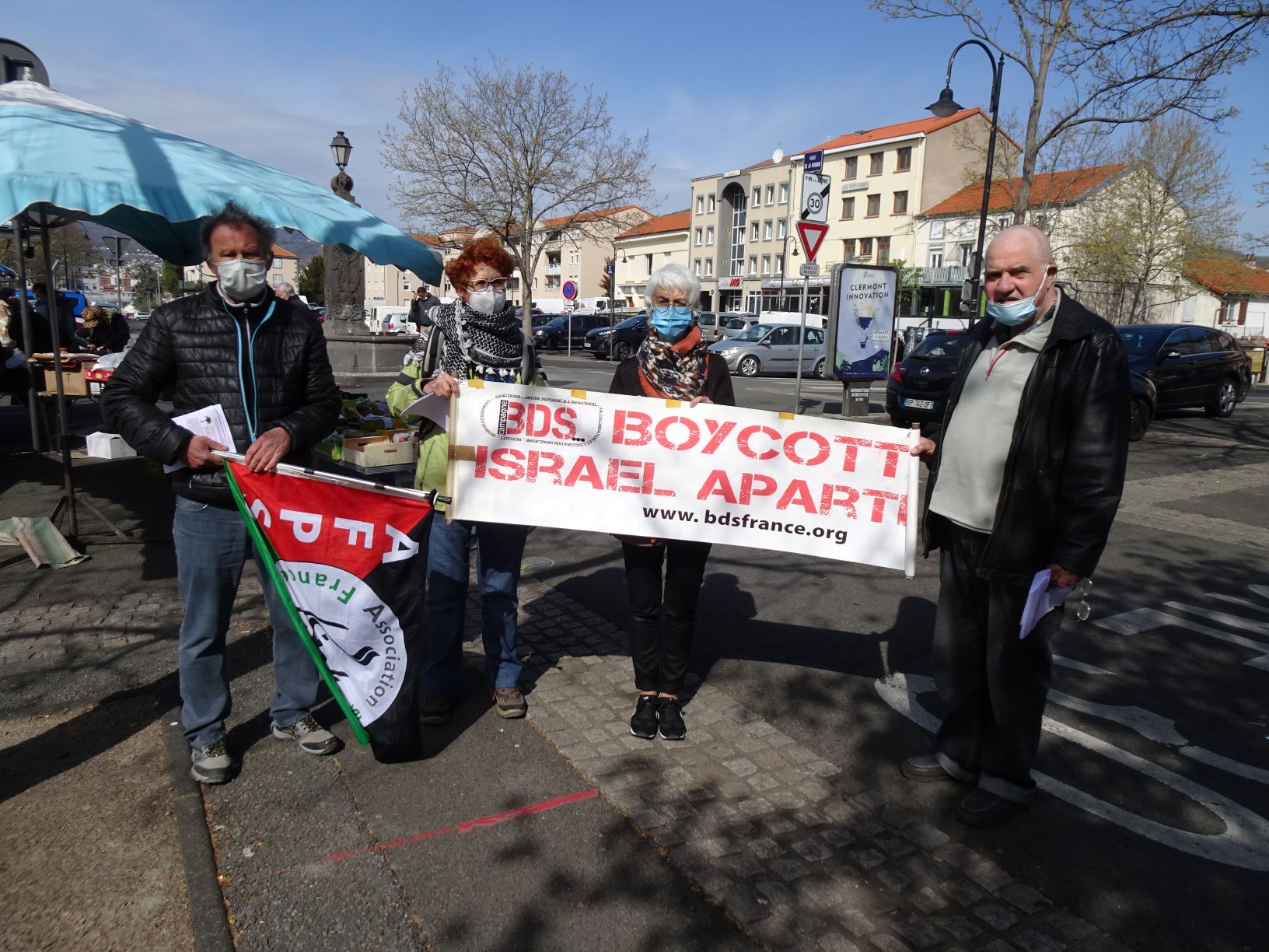 Le 9 avril sur le marché populaire de Montferrand (600 tracts). Un bon accueil nous a été fait, avec des discussions intéressantes, bien que nous ayons pu perturber quelques commerçants vendant des dattes israéliennes, Mehadrin notamment.