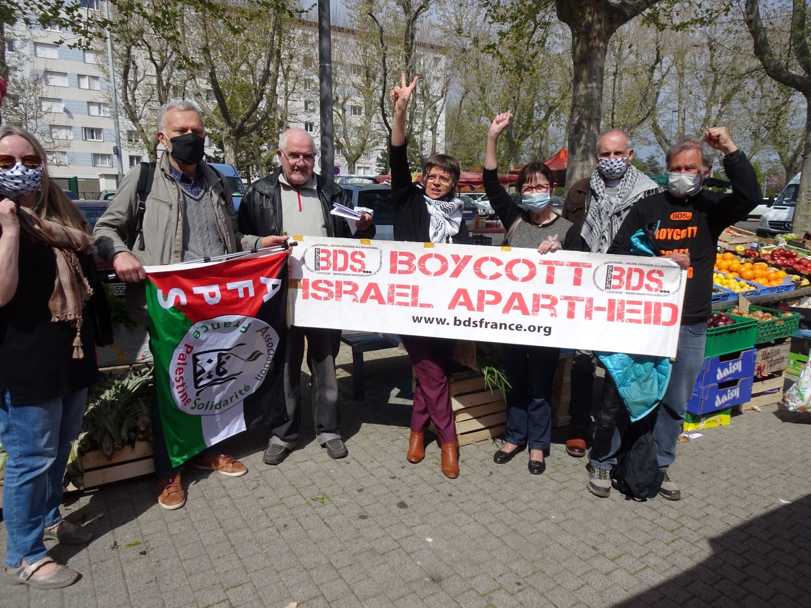 Le 20 avril (650 tracts) au marché populaire de La Gauthière, réduit en cette période aux stands alimentation. Très bon accueil, des discussions intéressantes, des remerciements appuyés de femmes et hommes de tous âges. Notre action a perturbé quelques commerçants vendant des dattes israéliennes, Sahara Gold, King of Dates ou Desert Finest notamment, certains en même temps que des dattes palestiniennes Jericho Delights. Des passant-e-s se sont joints aux discussions.