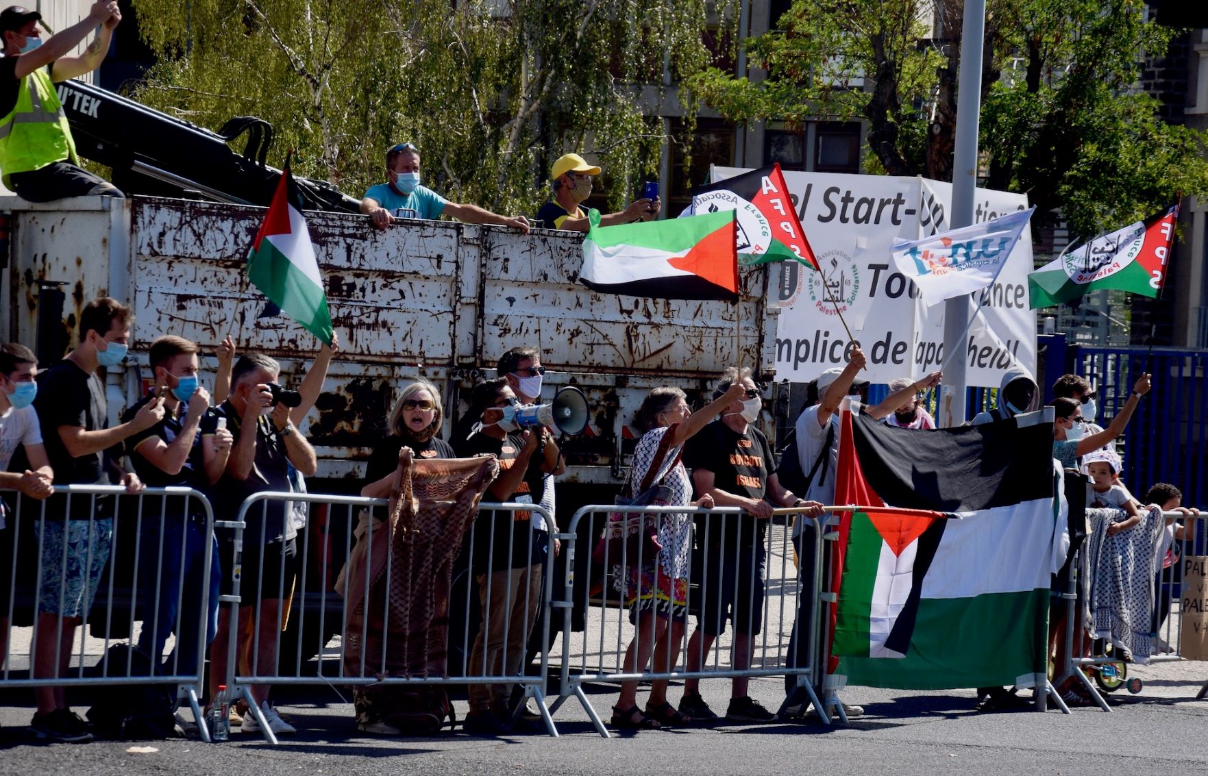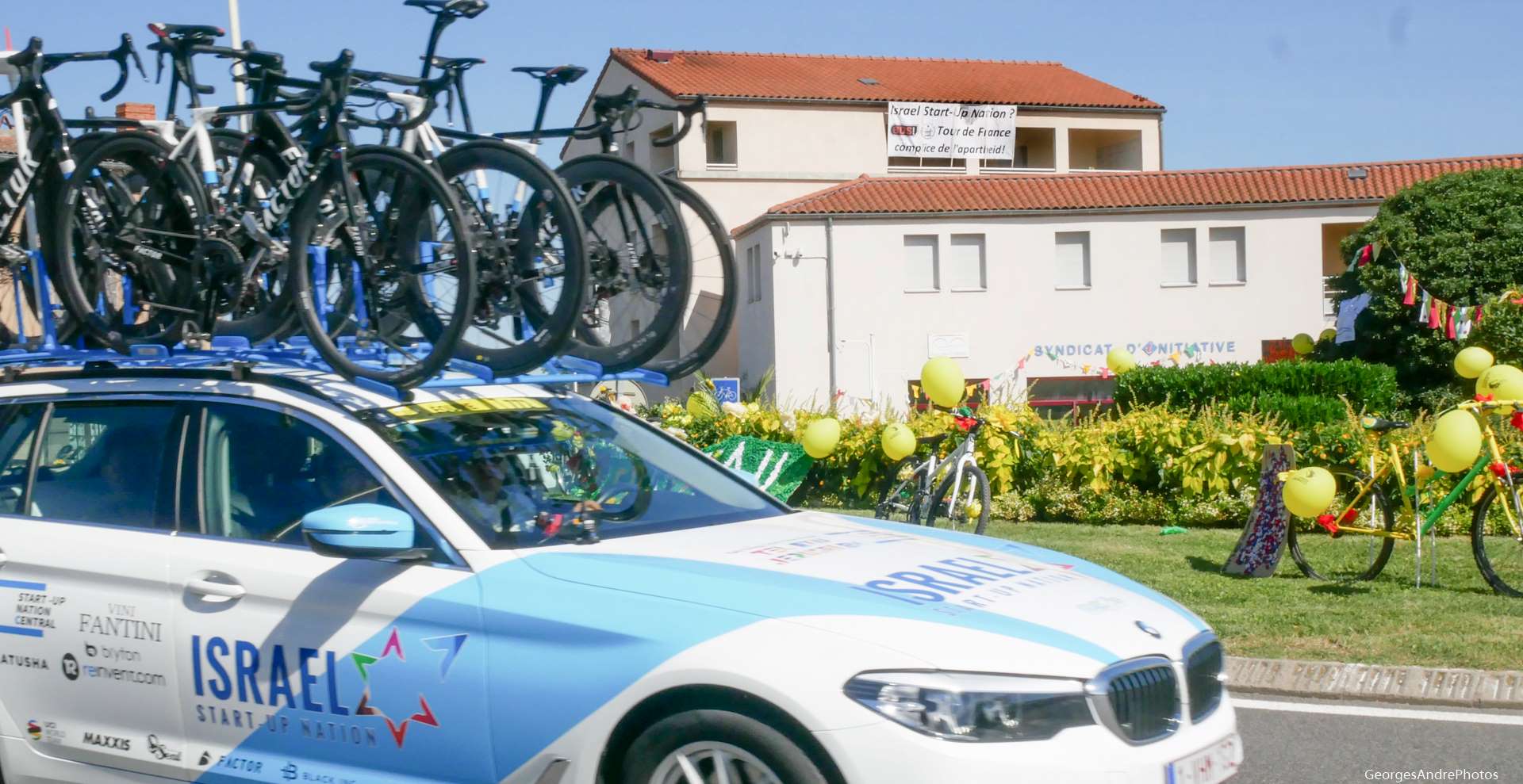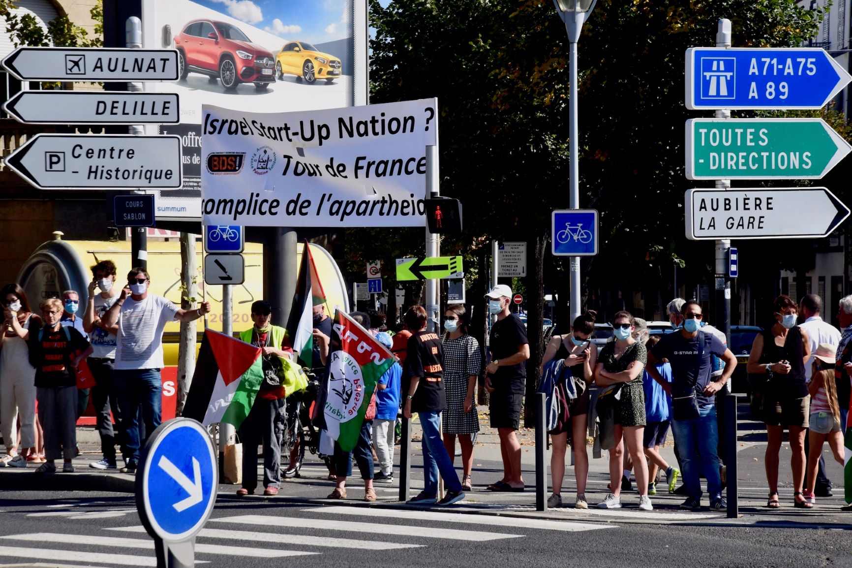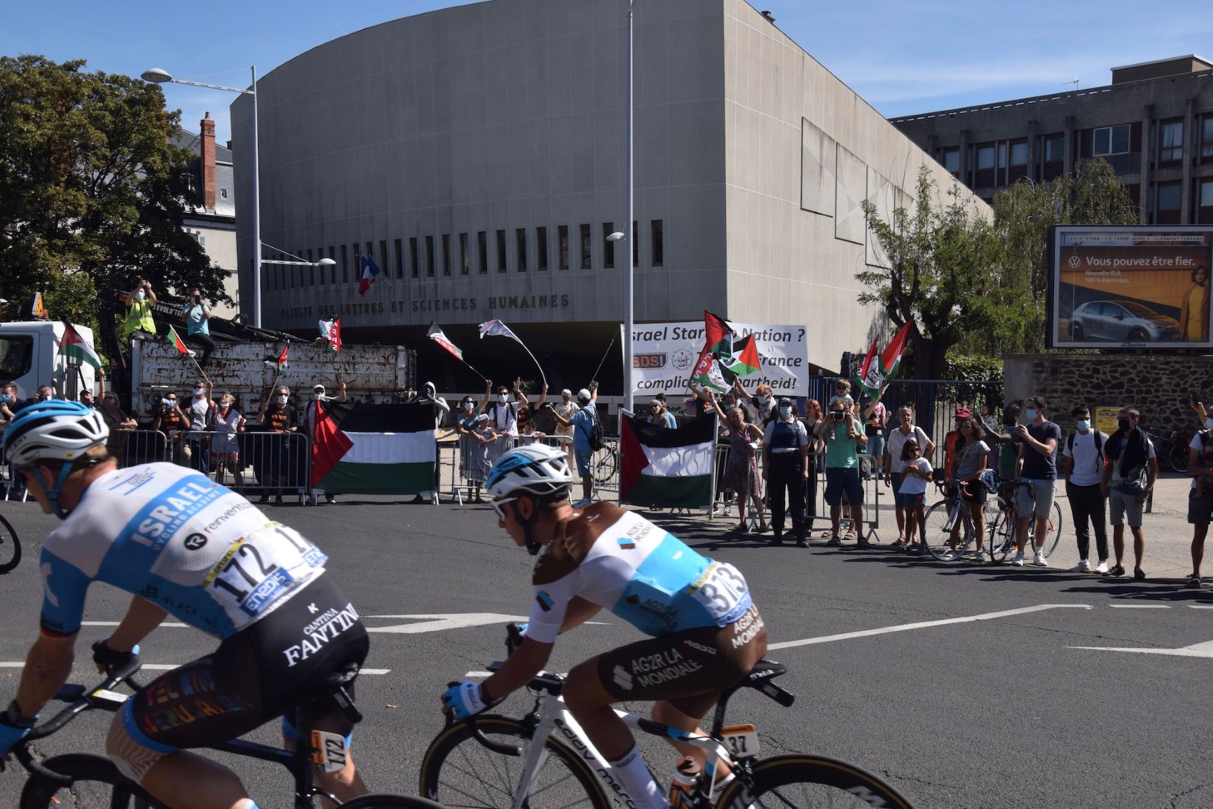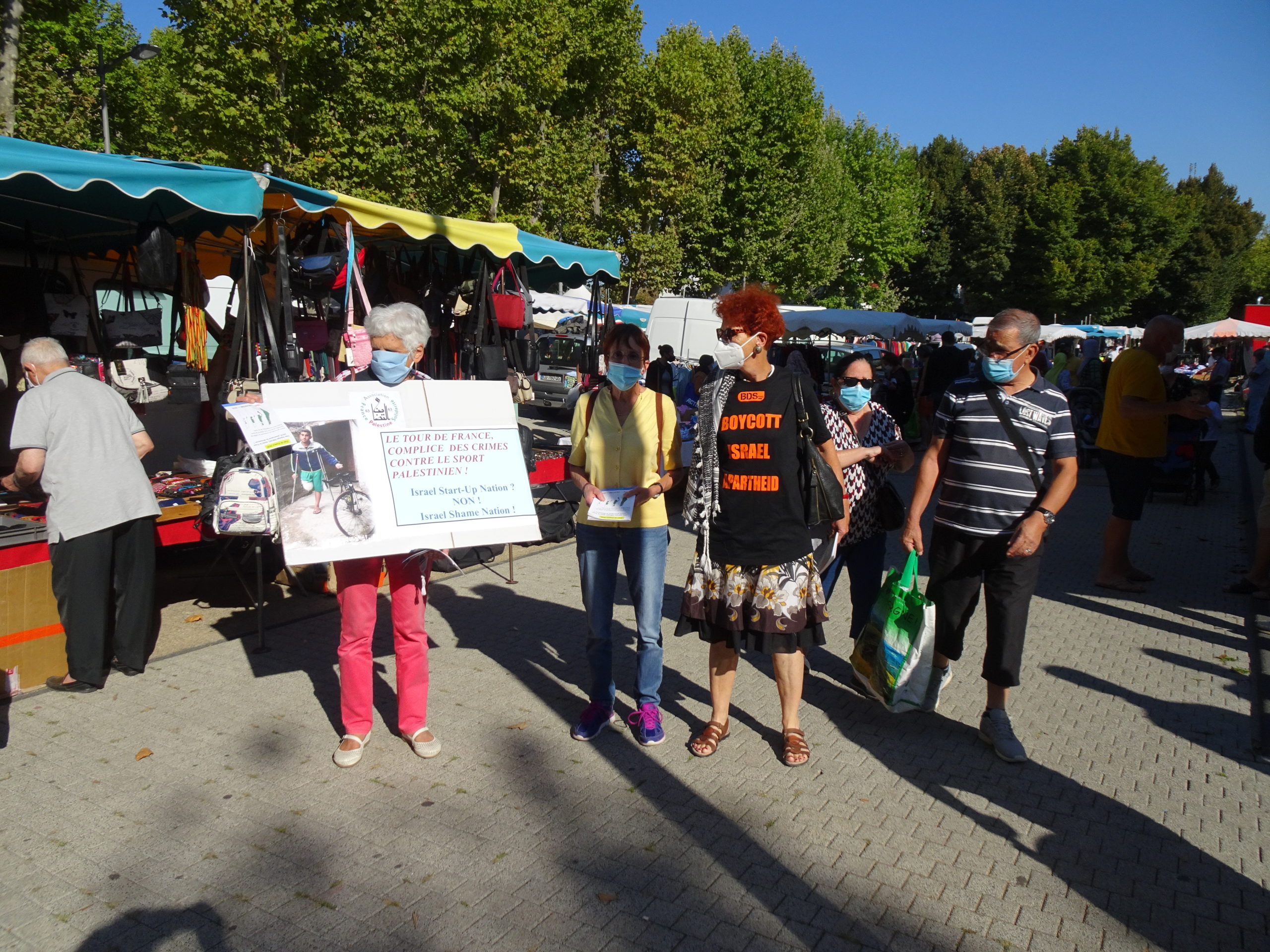 Très visible à l’arrivée de la caravane du Tour comme de celle des coureurs une heure plus tard. Le public nombreux était globalement réceptif à l’action et la distribution du tract dénonçant la participation de l’équipe cycliste « Israel Start-Up Nation ». Plusieurs personnes, jeunes pour la plupart, ont souhaité avoir des informations sur cette équipe « Israel » et la propagande israélienne sur le Tour.
