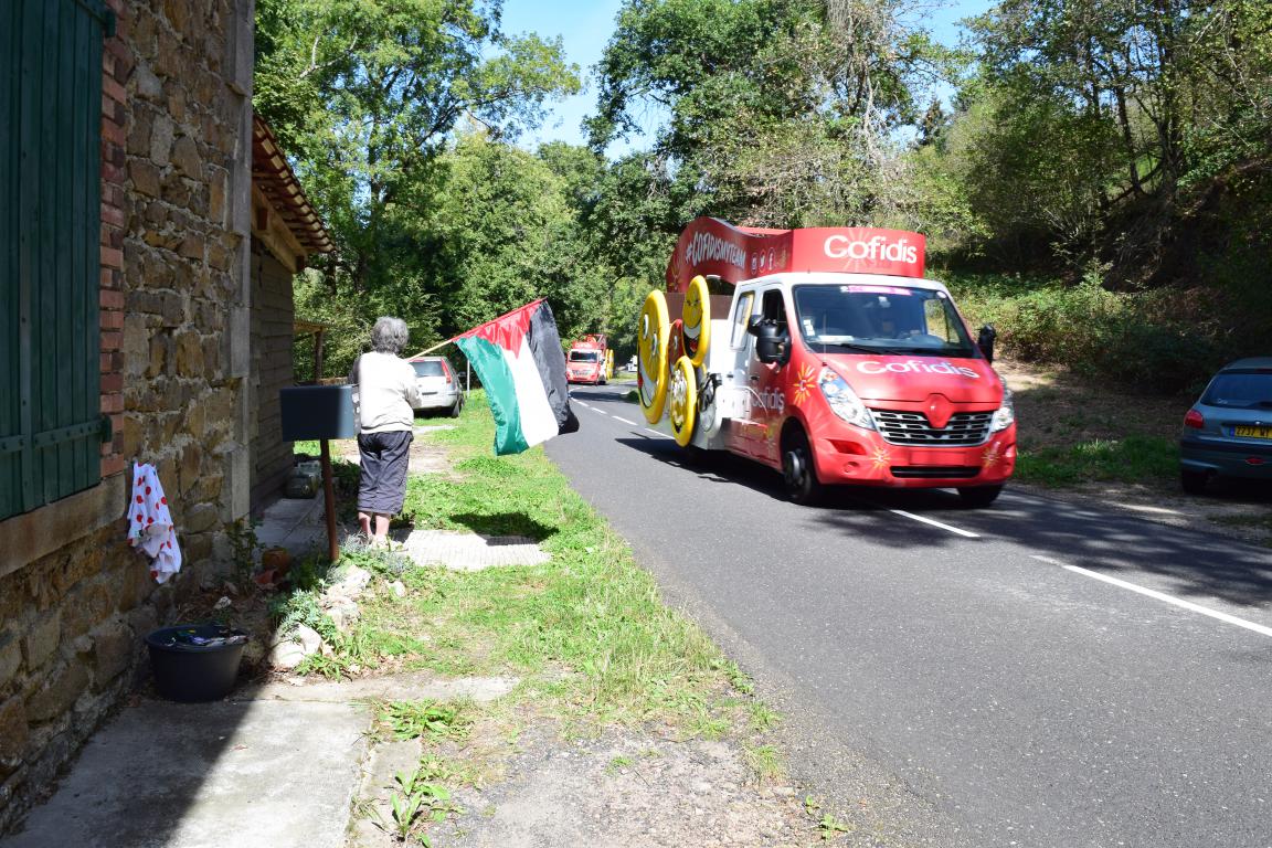 AUBUSSON d’AUVERGNE – 12/09 – Une adhérente de l’AFPS 63 dont la maison est située sur le parcours de l’étape Clermont-Lyon avait apposé sur son mur un drapeau palestinien et le drapeau AFPS qui ont été filmés deux fois en direct par France Télévisions.