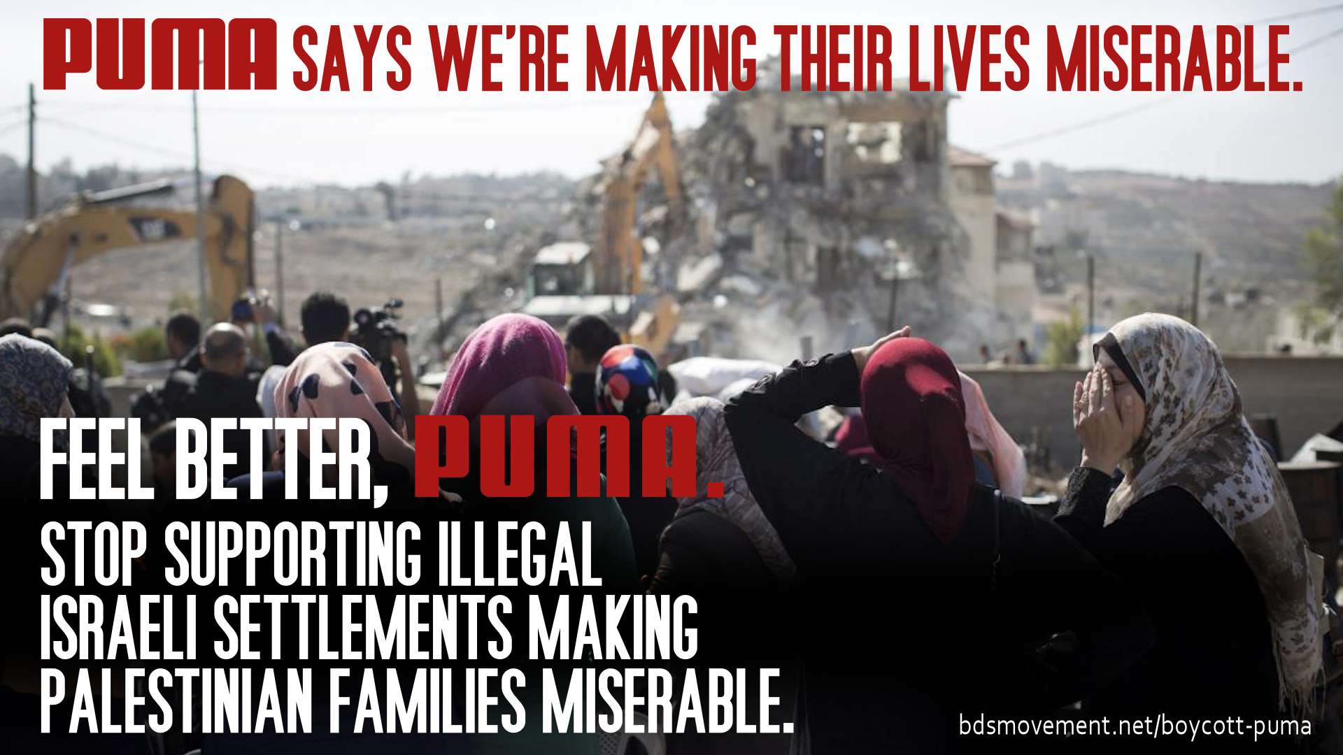 C’est vrai. Puma dit que les appels de principe des groupes de défense des droits humains et des associations sportives pour que la compagnie mette fin à son soutien aux colonies israéliennes illégales chassant les familles palestiniennes de leurs terres lui rendent la vie misérable. Les colonies israéliennes illégales et l’infrastructure d’occupation associée volent les Palestiniens de leurs terres, séparent les communautés palestiniennes et nient aux Palestiniens leur droit à la liberté de mouvement.