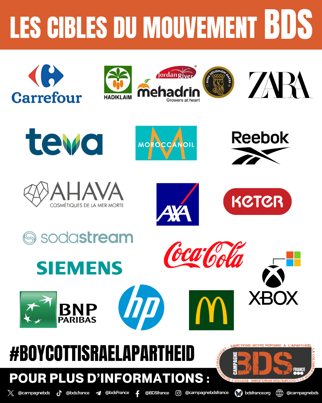 Le mouvement pour la liberté, la justice et l’égalité des Palestiniens lutte contre l’occupation israélienne, la colonisation des territoires arabes par Israël et son système d’apartheid. La campagne Boycott, Désinvestissement et Sanctions (BDS) vise l’état d’Israël, les institutions et les entreprises israéliennes complices des crimes d’Israël. BDS est devenu, pour des gens de divers horizons, un moyen efficace d’exprimer leur mobilisation humanitaire et antiraciste en solidarité avec la Palestine.