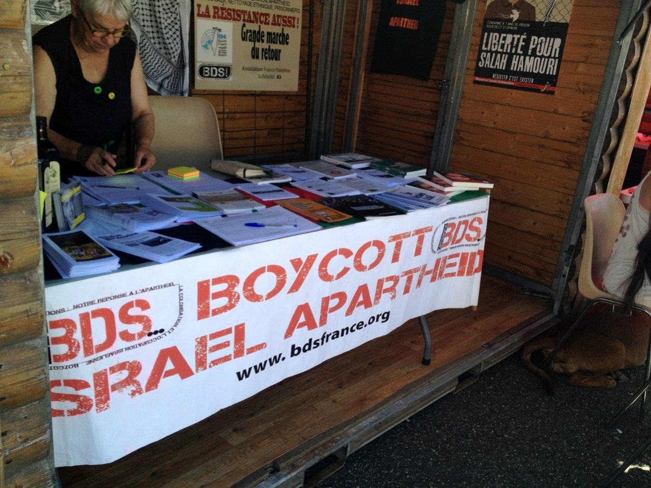 A la fin du débat l’afps 63 a distribué une cinquantaine de cartes « libérez Salah Hamouri » en demandant qu’un maximum soit envoyé à Mr Macron dans les prochains jours afin d’obtenir la libération de Salah le 30 juin (fin de la détention administrative). Sur le stand, des dizaines de signatures, très spontanées, de la pétition demandant la suspension de l’accord UE/Israël et toujours un gros succès pour l’huile d’olive et les keffiehs de Palestine (près de 200 euros de ventes).