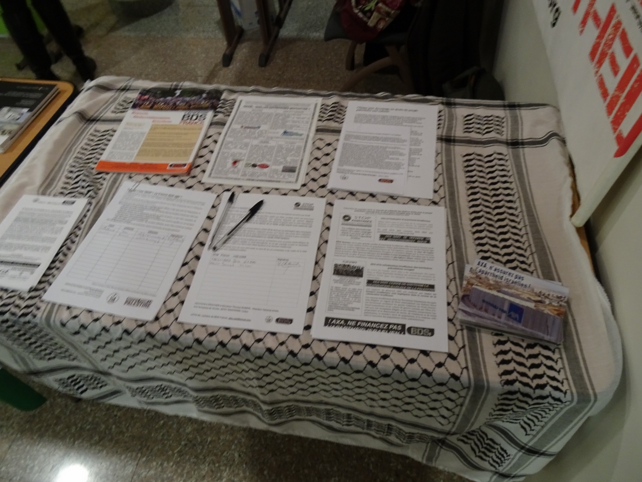 Environ 800 délégués ont assisté au Congrès national de la FSU à Clermont-Ferrand. Cinq militant.e.s AFPS 63 et BDSF 63 ont tenu un stand le 11 décembre, et distribué 400 ex. d’un tract « Les enfants palestiniens dans le viseur de la répression israélienne », appelant au BDS. Le stand présentait aussi une expo photos commentées sur les enfants palestiniens (merci au GL de Versailles, ainsi qu’à Activestills), ainsi qu’une table de presse sur Gaza, sur les prisonniers, sur le « modèle israélien », et sur BDS (notamment AXA et HP). La petition sur AXA a recueilli 15 signatures et la pétition « Trump c’est trop » , 21 signatures. De nombreux échanges ont eu lieu avec les congressistes, parfois membres du mouvement de solidarité d’autres villes, ainsi qu’avec des militants d’autres stands (Amnesty, ICAN pour l’interdiction des armes nucléaires, RESF, …)