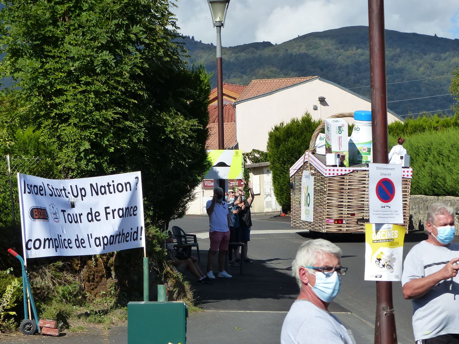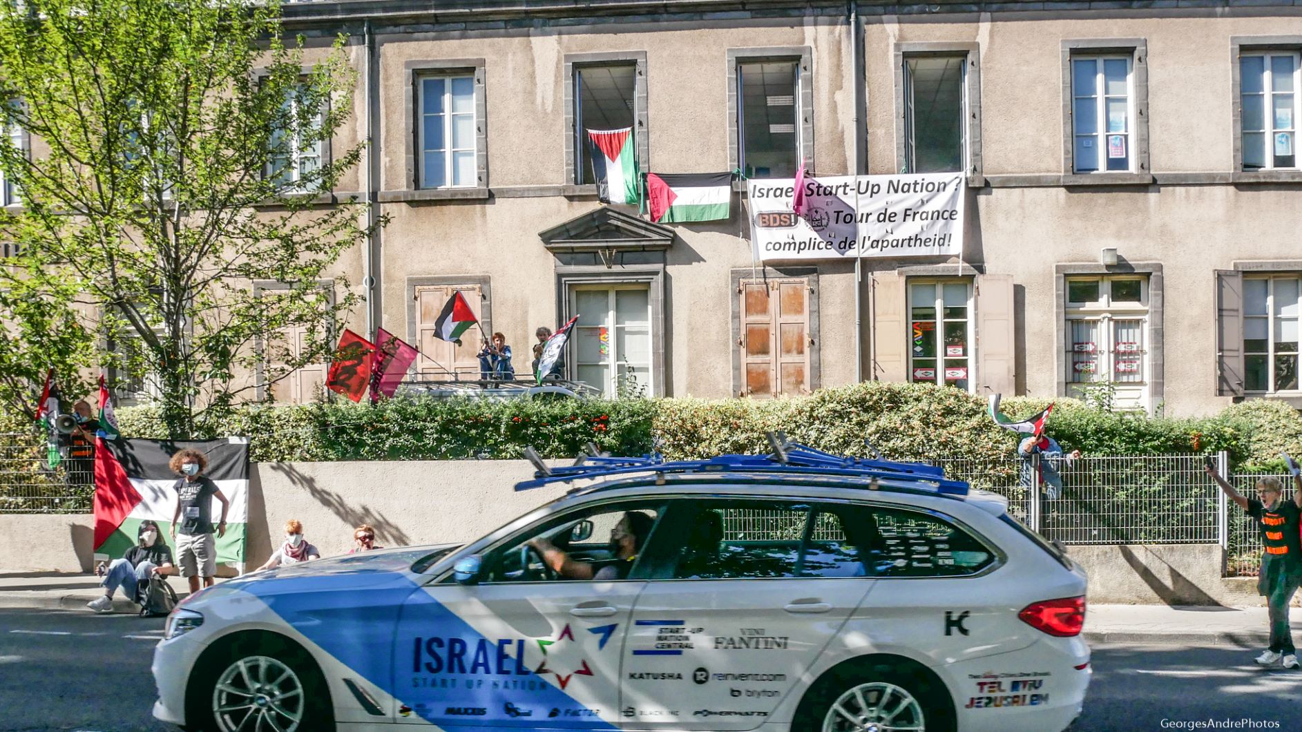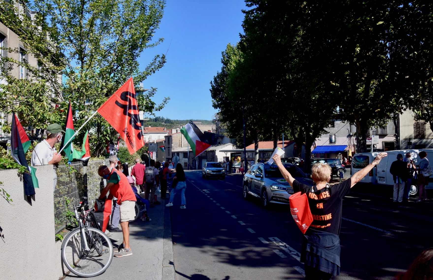 Déco avec grande banderole contre Israel Start-Up Nation et la complicité du Tour de France, et drapeaux aux fenêtres + militants sur le toit d’un camion + militants des deux côtés de la route, avec un bon mégaphone (soutenus par des passants solidaires, dont un Palestinien de 48) qui ont indiqué à toutes les voitures de la caravane, et aux coureurs :