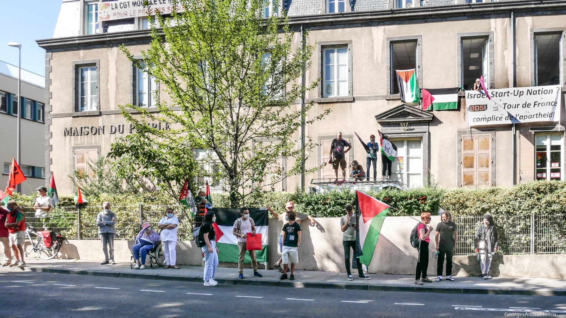 25 militants BDS-63 (AFPS, BDSF, Solidaires, UNEF, RESF, CGT, LFI, Tps des cerises, …) ont décoré la façade de la maison du peuple des syndicats de Clermont devant laquelle passait le Tour, avec l’aide de SUD Education et Solidaires.