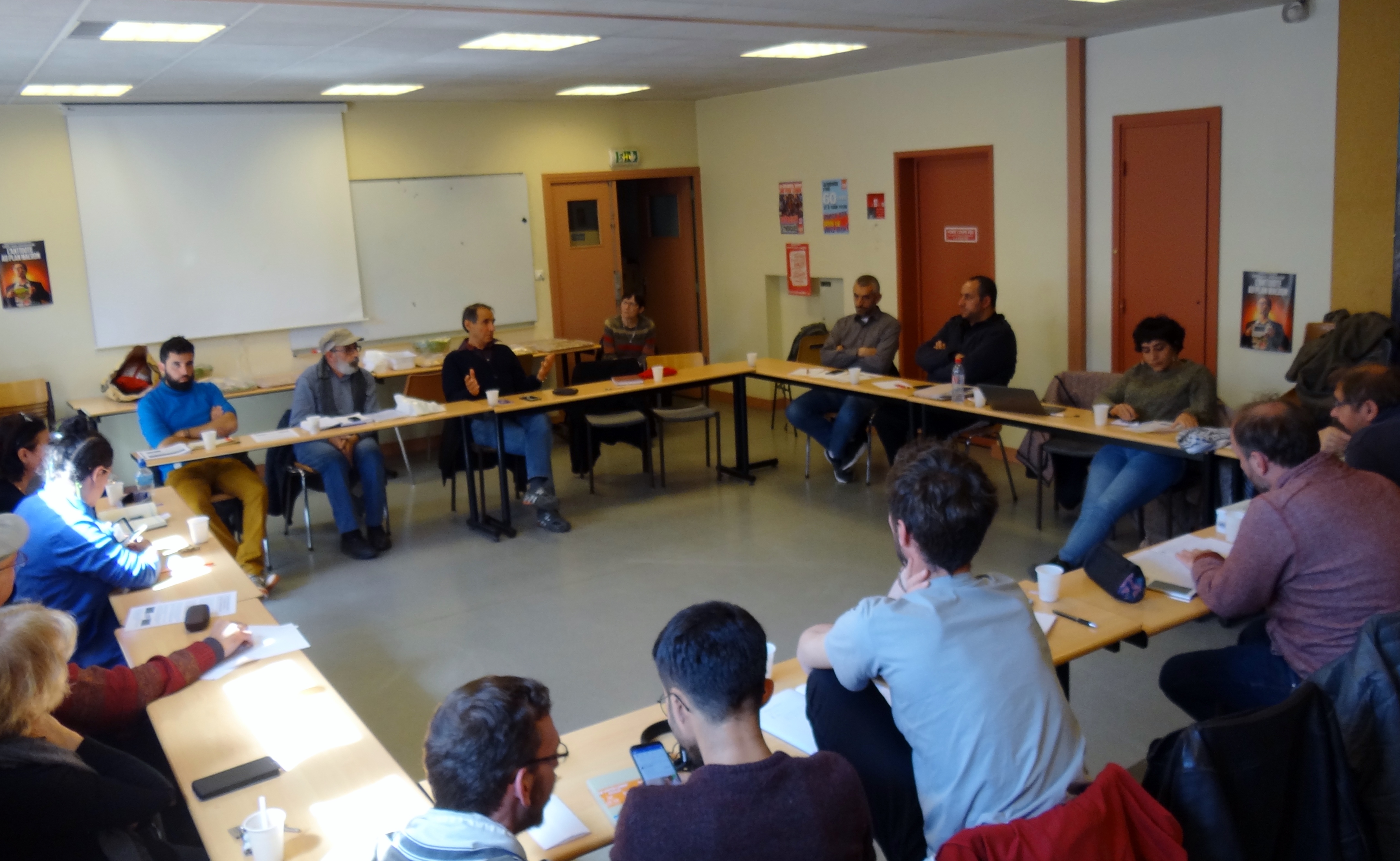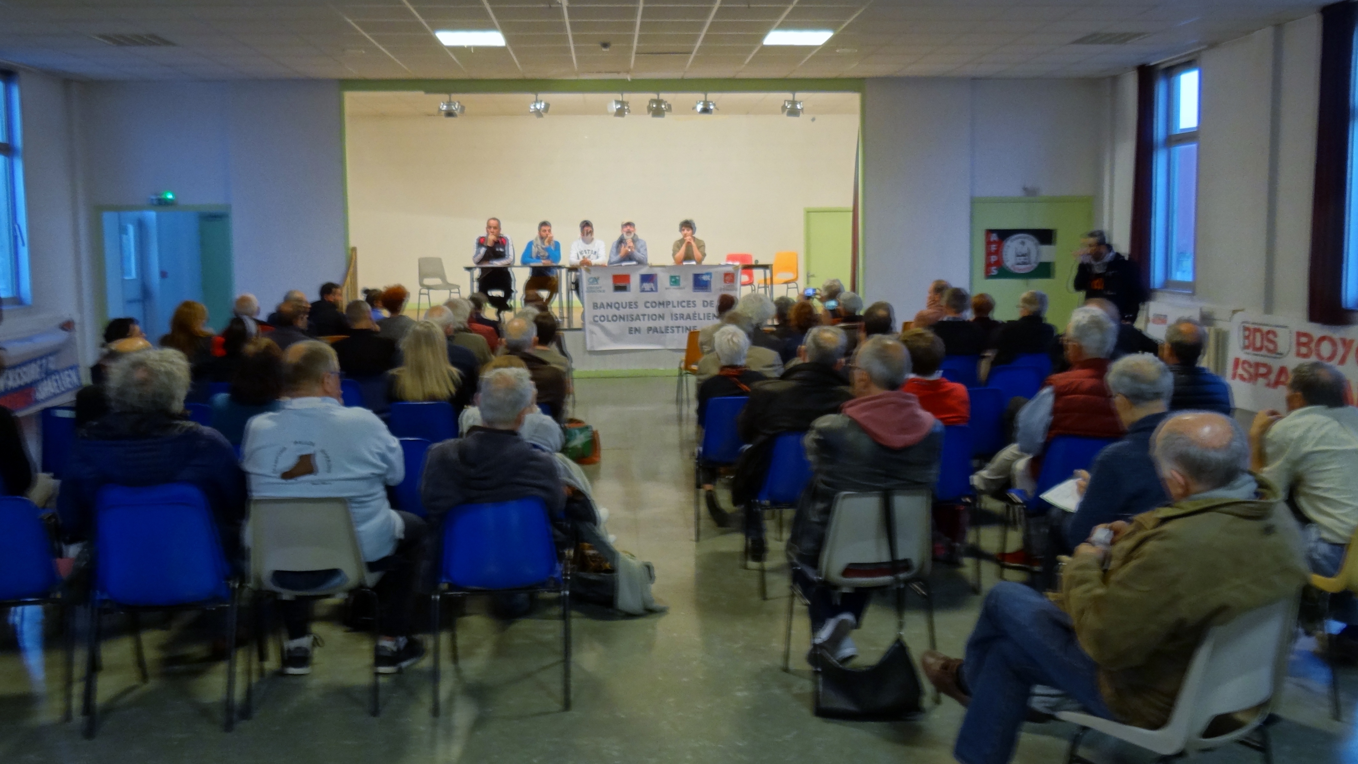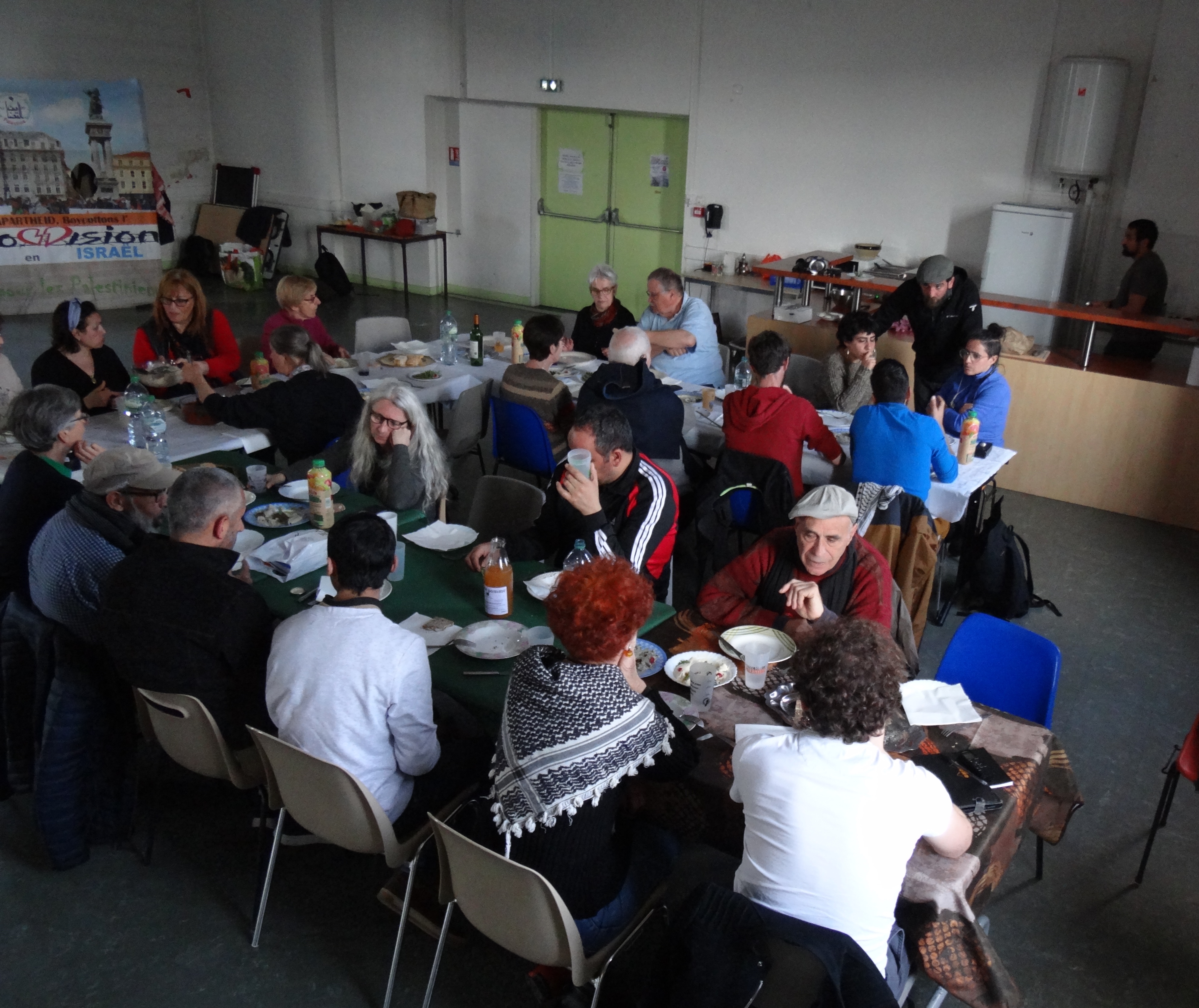 Les syndicalistes palestiniens et une quinzaine de militants syndicaux, AFPS et BDSF ont ensuite partagé un repas avant une réunion publique, avec 65 personnes qui ont écouté avec attention les témoignages de 4 membres de la délégation de la GFIU, puis ont pu leur poser de nombreuses questions. Les thèmes abordés ont concerné, entre autres, l’apartheid israélien, le syndicat « officiel » palestinien et sa collaboration obligatoire avec le syndicat sioniste israélien Histadrut qui capte la moitié des cotisations de travailleurs palestiniens, l’importance du mouvement BDS pour soutenir les Palestiniens. D’autres témoignages ont concerné les violations des droits humains, les annexions liées au Mur d’apartheid, les emprisonnements massifs arbitraires.